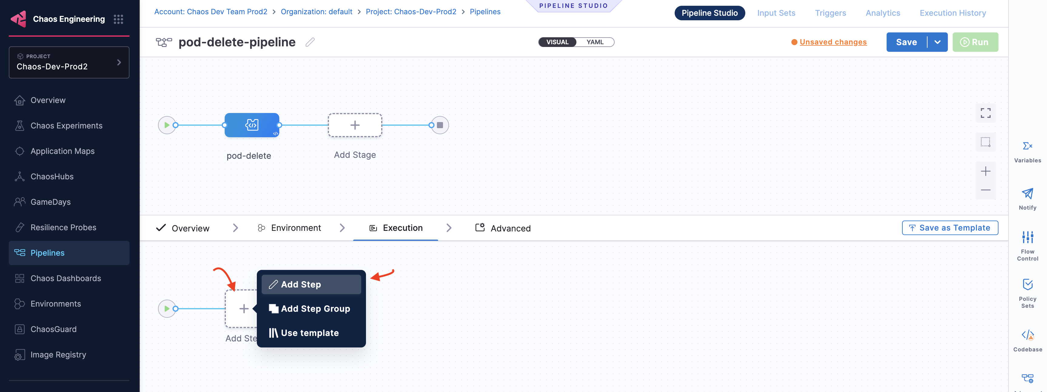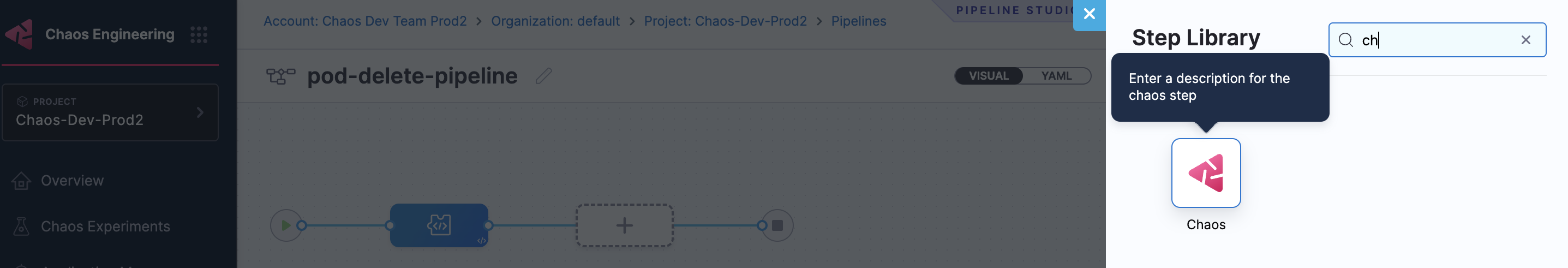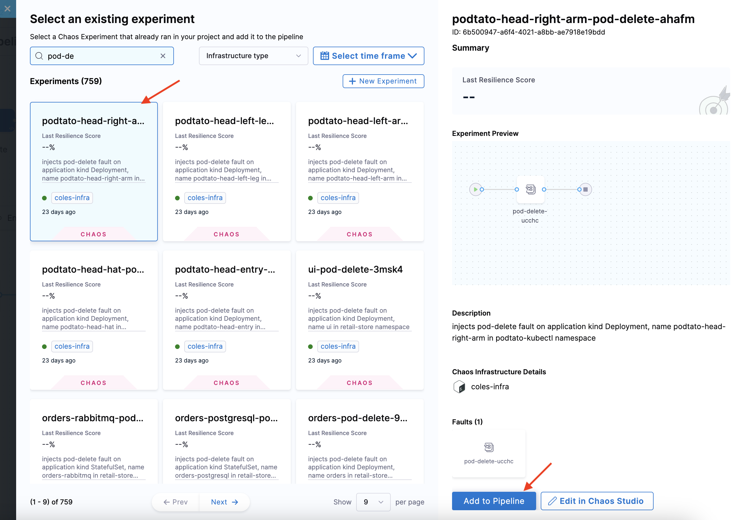 Choose from the list of chaos experiments, and click Add to Pipeline.