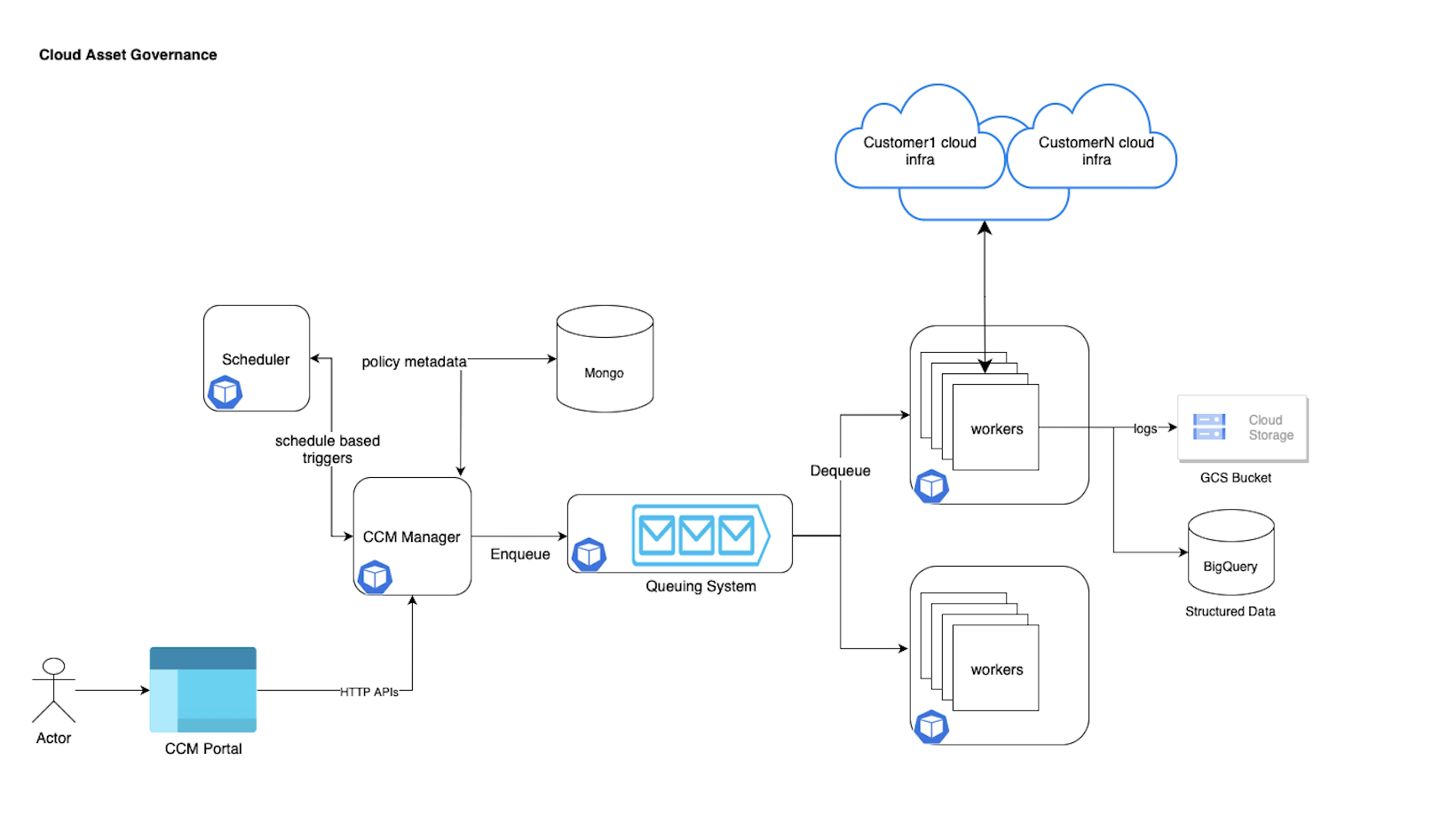 - The worker microservice, with the help of Cloud Custodian, does tasks from the line.