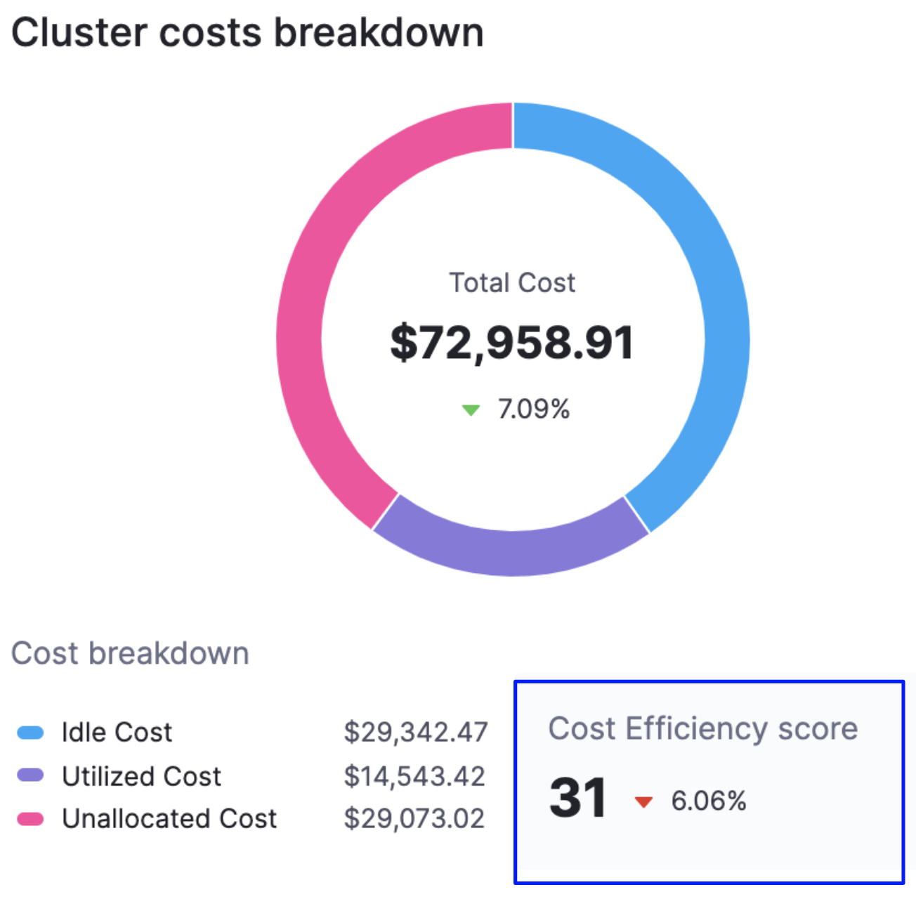 A measure of how cost-optimized your resource usage is across your clusters. It is derived from the total and idle (and or unallocated) spend of your resources.