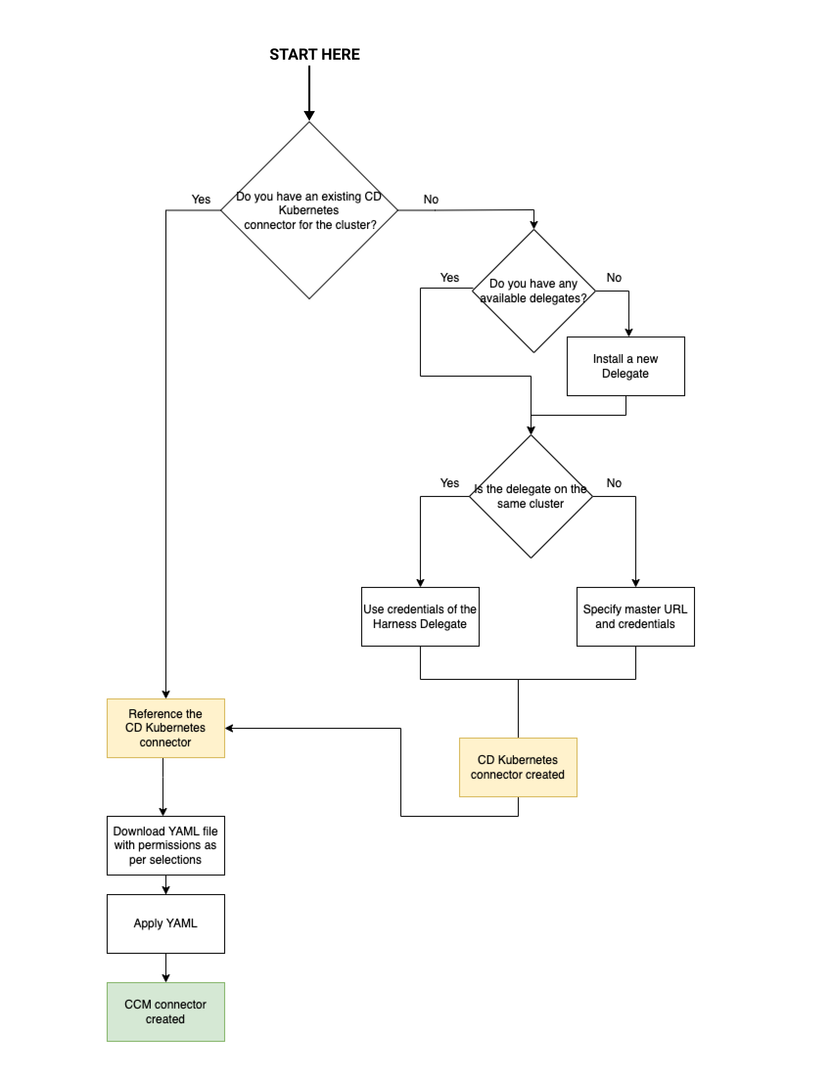 - Create a Harness cloud provider Kubernetes connector that targets the delegate. This ties your cluster and delegate to a representation of your cluster in Harness.
