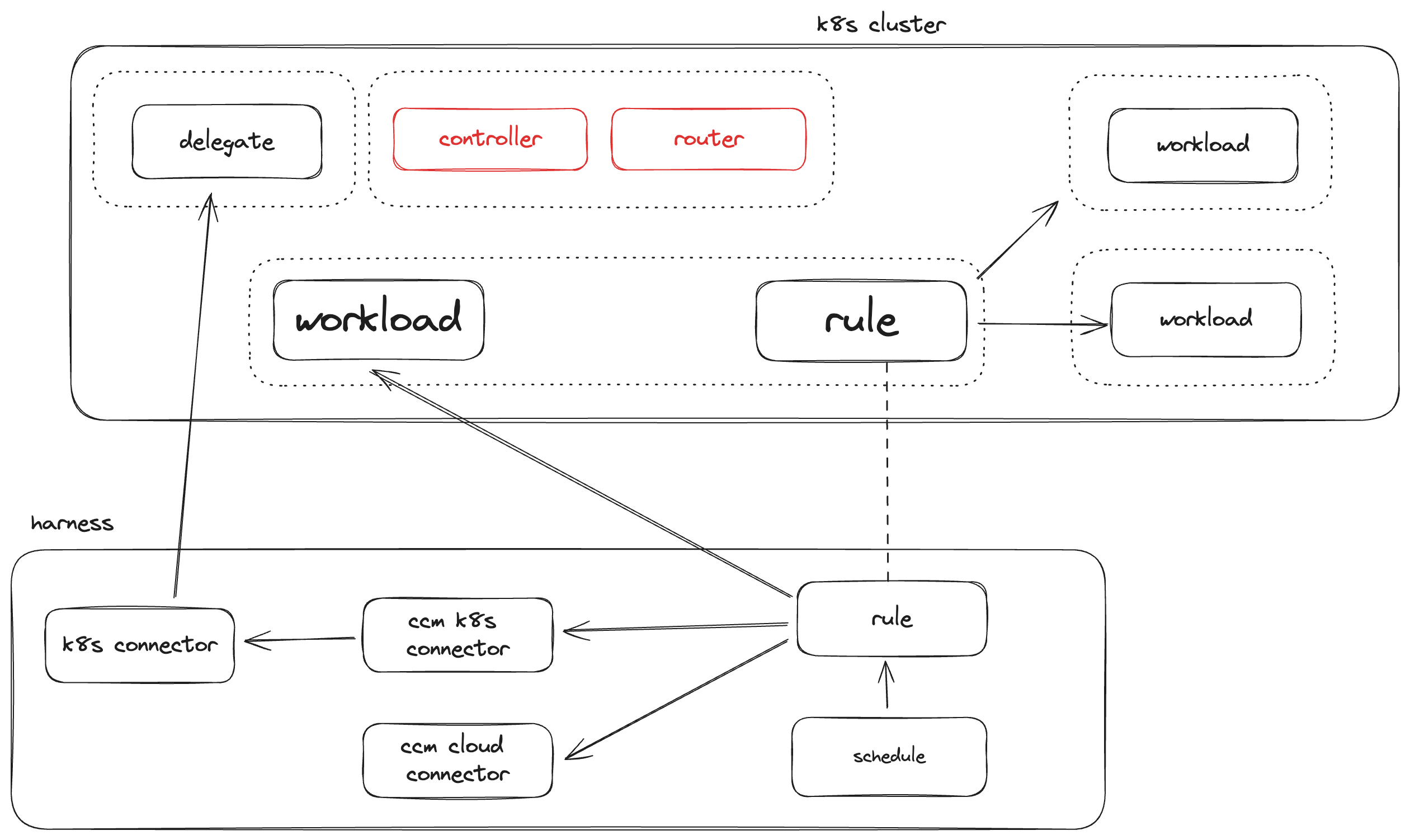 Harness can monitor the traffic of an ingress rule and bring pods up and down based off the traffic seen. It does this by modifying the ingress rule to send all traffic to the auto stopping router, and then the router sends the traffic to the service that backed the ingress resource.