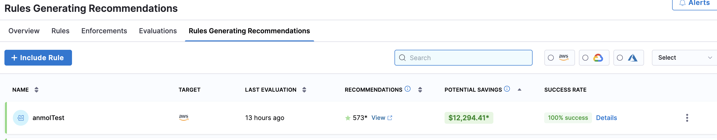 - Ignored list tag if the recommendation is added to the "Ignored list". - Option to view details about the recommendation like which Account (in case of Azure, AWS)/ Project (in case of GCP), resource (AWS, Azure) the recommendation was applied to, the enforcements, etc.