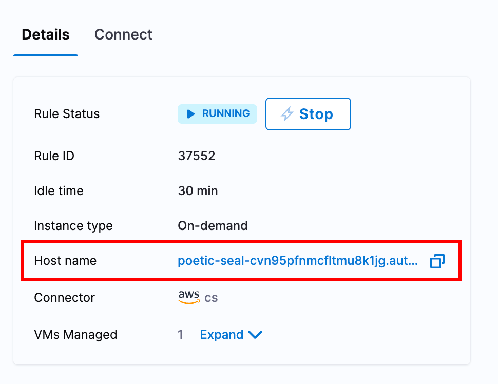 Hostname of the AutoStopping Rule: Hostname of the AutoStopping Rule for which you want to configure the ECG. You can copy the hostname from the AutoStopping dashboard. To obtain the hostname, do the following: