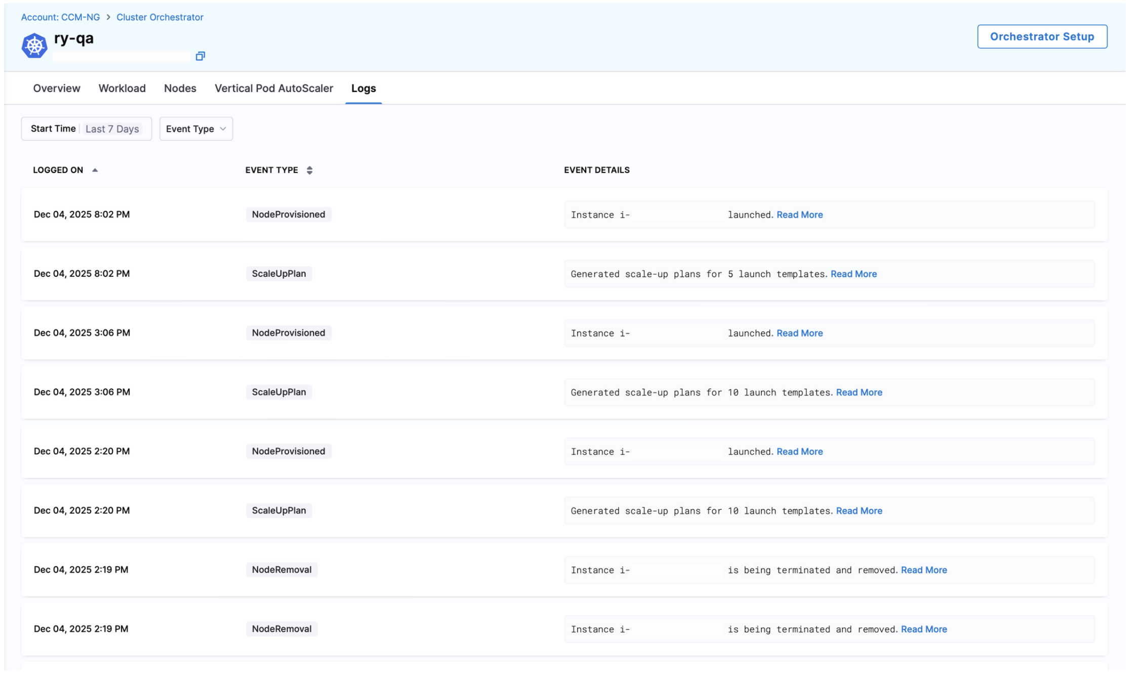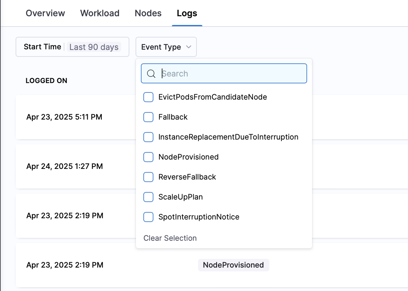 The Logs screen provides a chronological record of all cluster events and optimization activities. You can filter events by time period (e.g., Last 90 days) and event type.