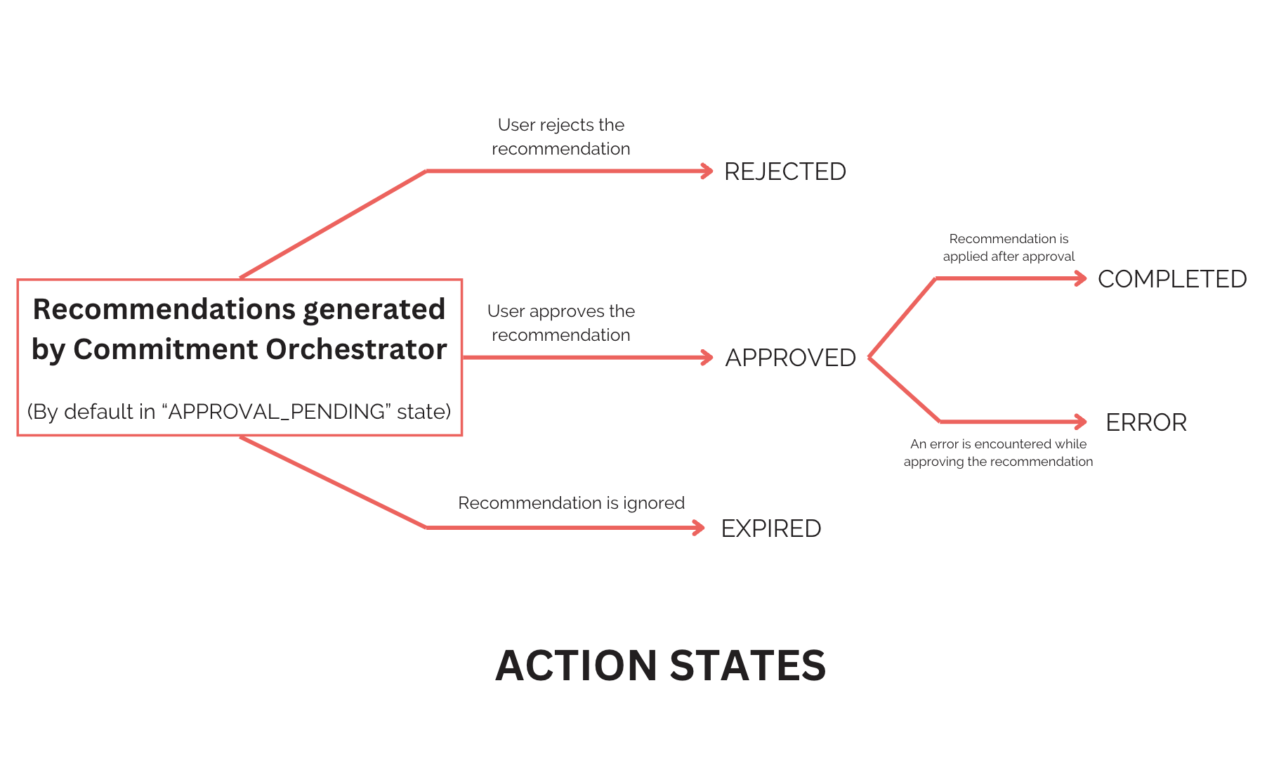 - APPROVAL_PENDING: The action is pending approval by the user. This is the default state for all recommendations and any pending actions will expire in 24 hours.