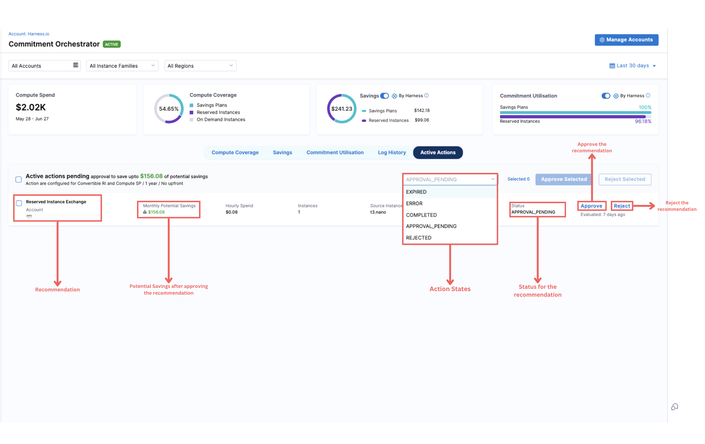 The Active Actions feature enables users to review and manage recommendations generated by the Commitment Orchestrator. You can view all recommendations categorized by day and type, then approve or reject them individually, in subsets, or all at once across different master accounts and regions.