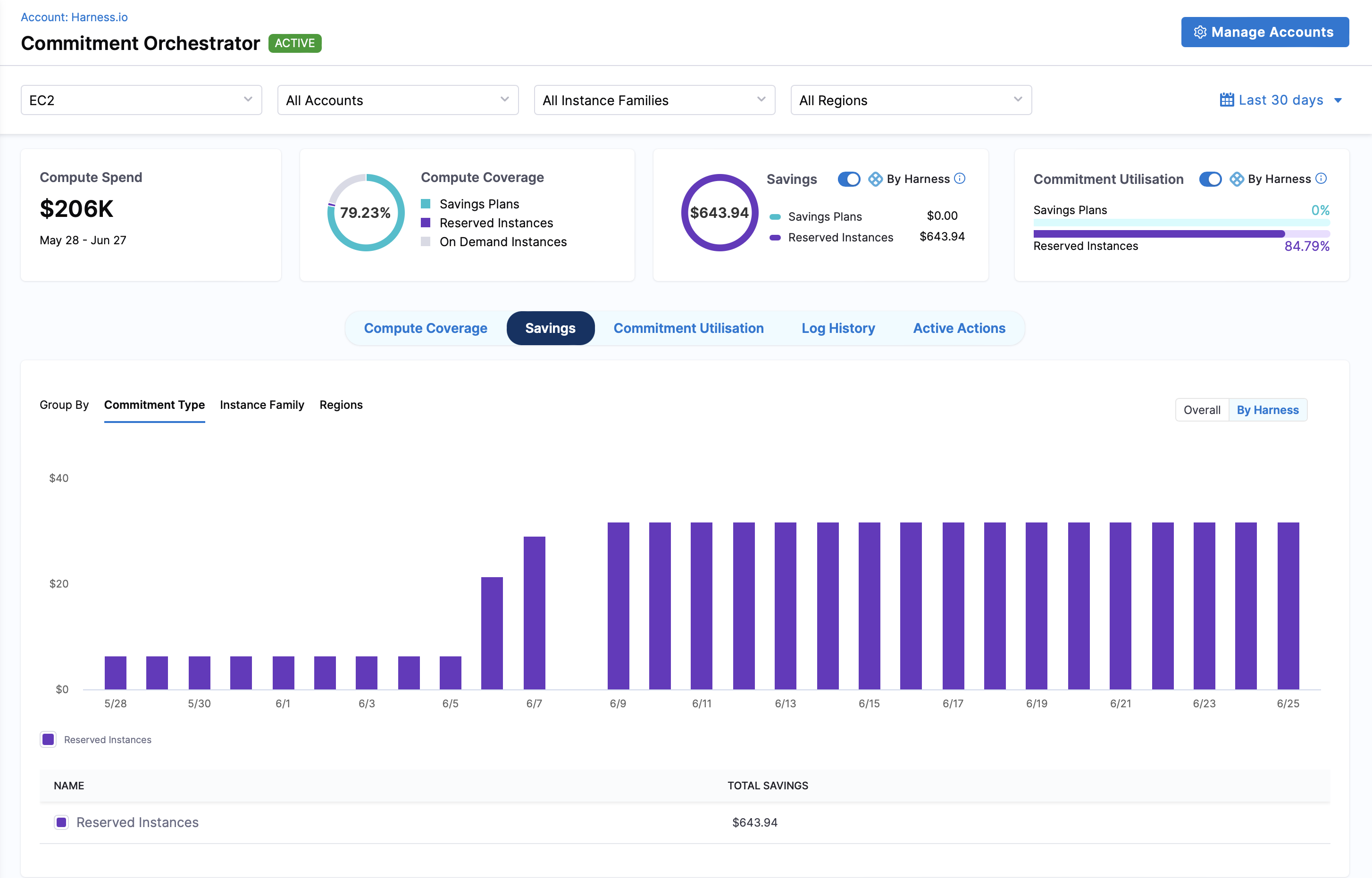 Savings: Total cost savings achieved through Reserved Instances, Savings Plans as compared to On-Demand rates. This shows the actual dollar amount saved by using commitment orchestration and helps quantify the ROI of your optimization efforts.