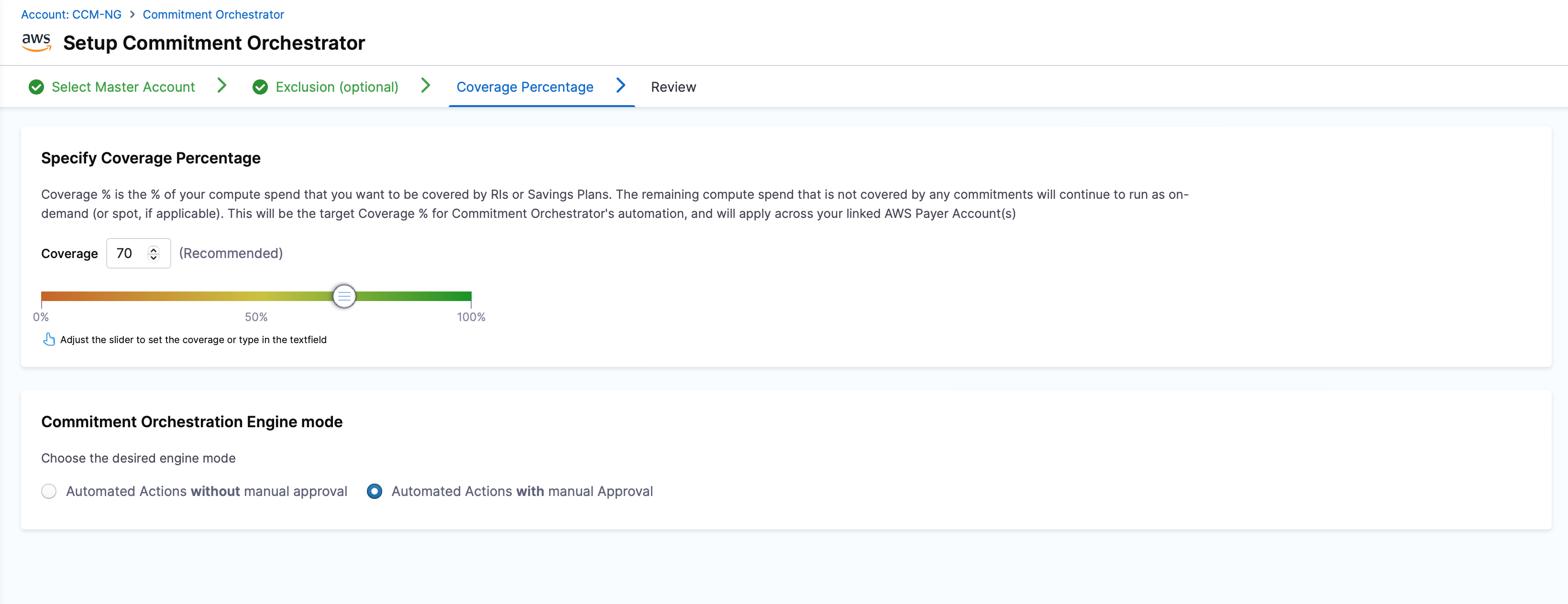 Coverage Percentage: The Coverage percentage is the percentage of your compute spend that you want to be covered by Savings Plans or Reserved Instances. The remaining amount will continue to run as on-demand.