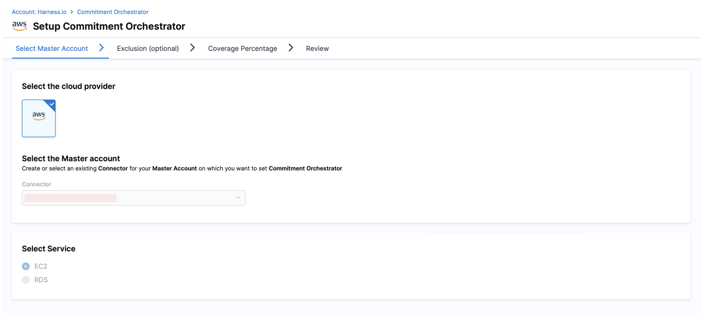 You can either select an existing connector for your master account or create one. Please note, even if "Commitment Orchestrator" is enabled in Connector Set Up for any other Account except for Master, it will not be visible in the connector list in Commitment Orchestrator Setup since Commitment Orchestrator requires Master Account connector.