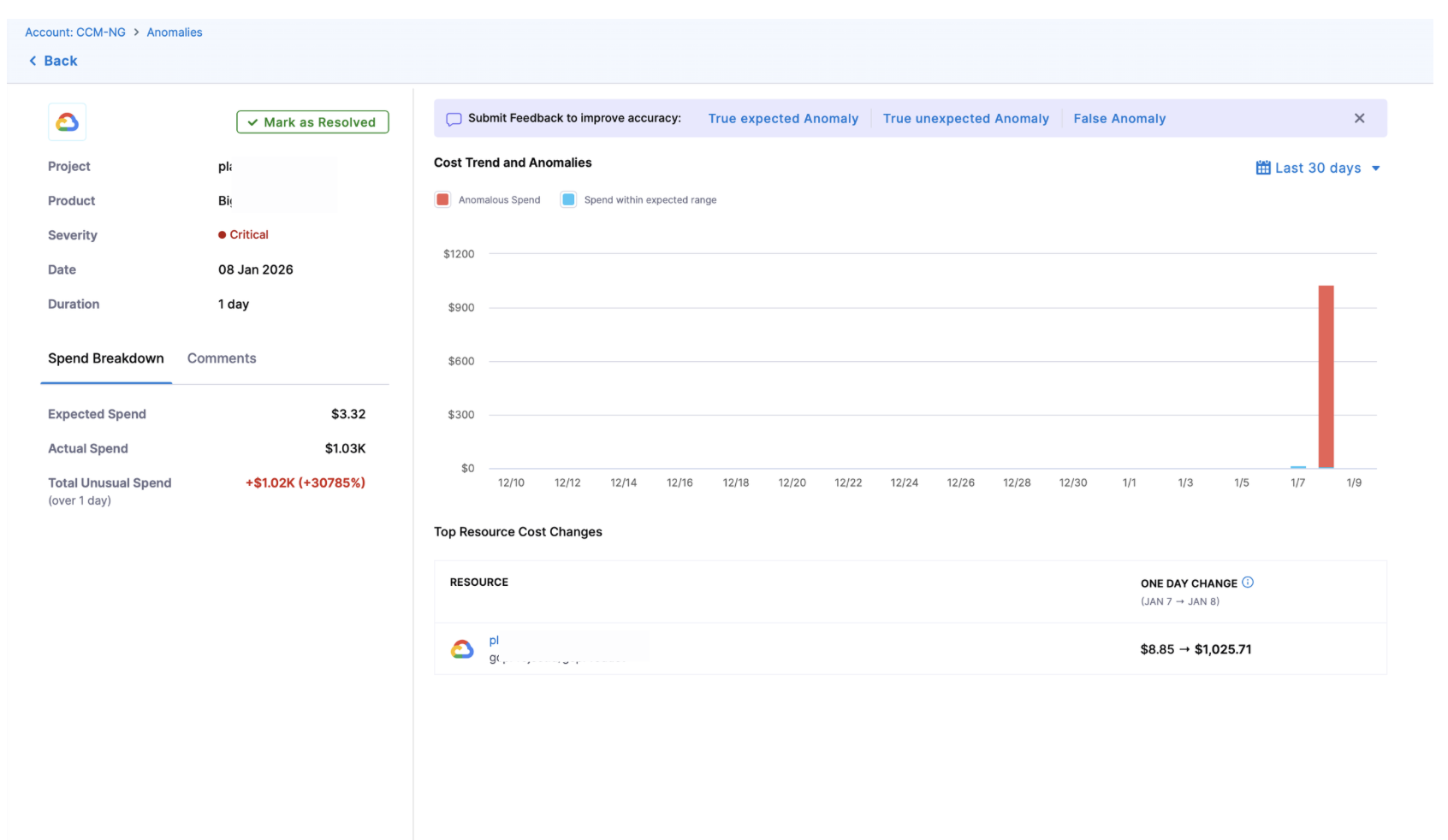 CCM also offers an advanced feature under a feature flag for AWS, GCP, and Azure that enables real-time anomaly detection: