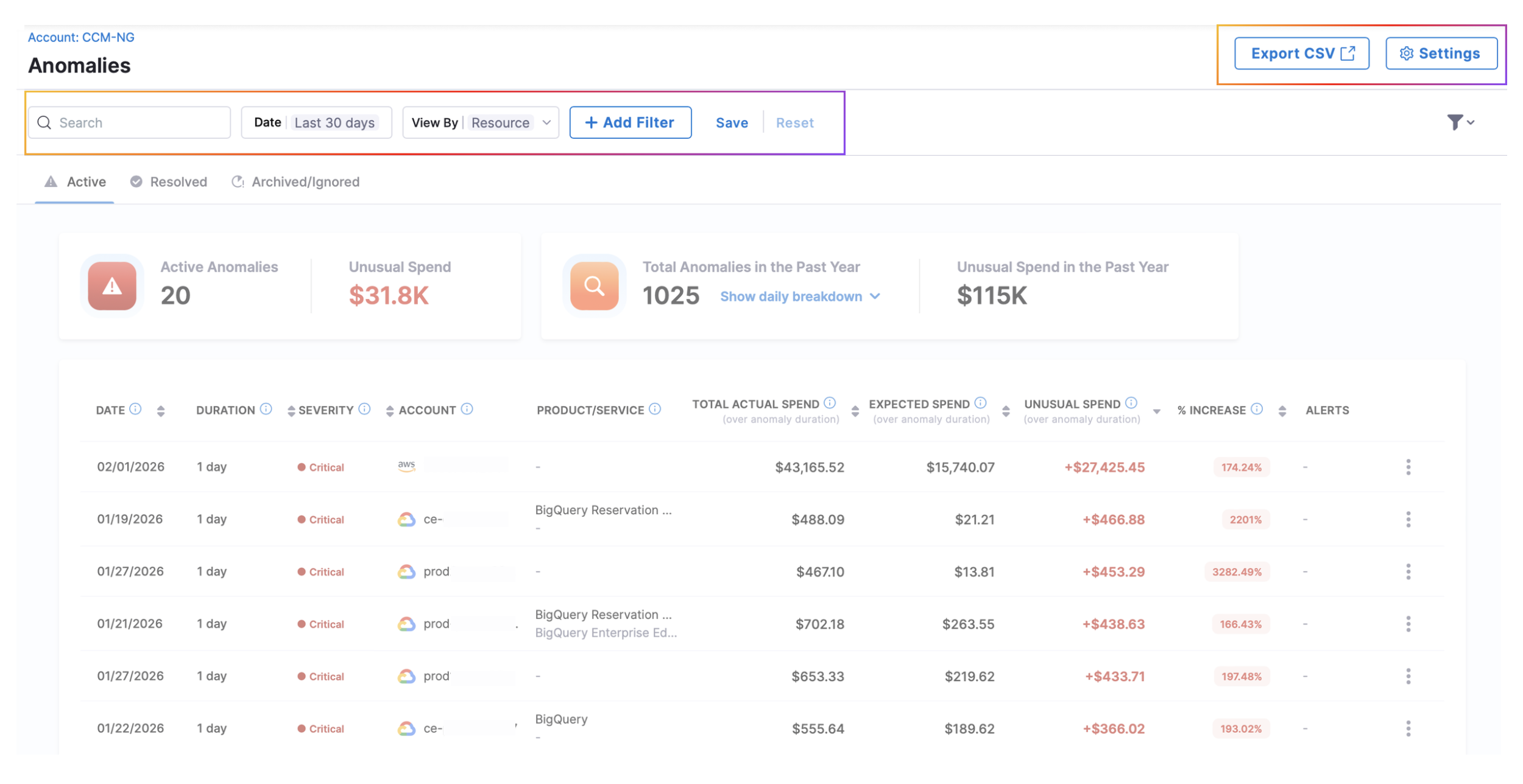 The Anomalies Overview page provides a comprehensive view of all detected anomalies across your cloud infrastructure.