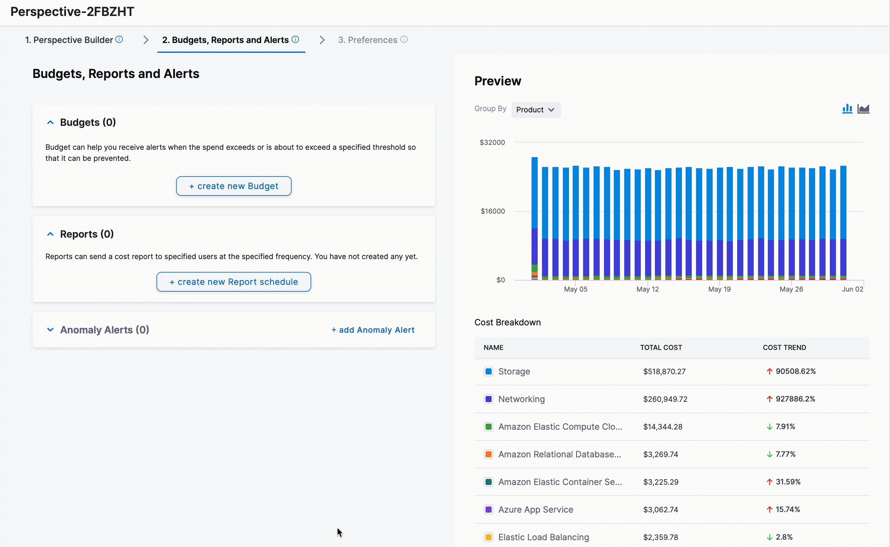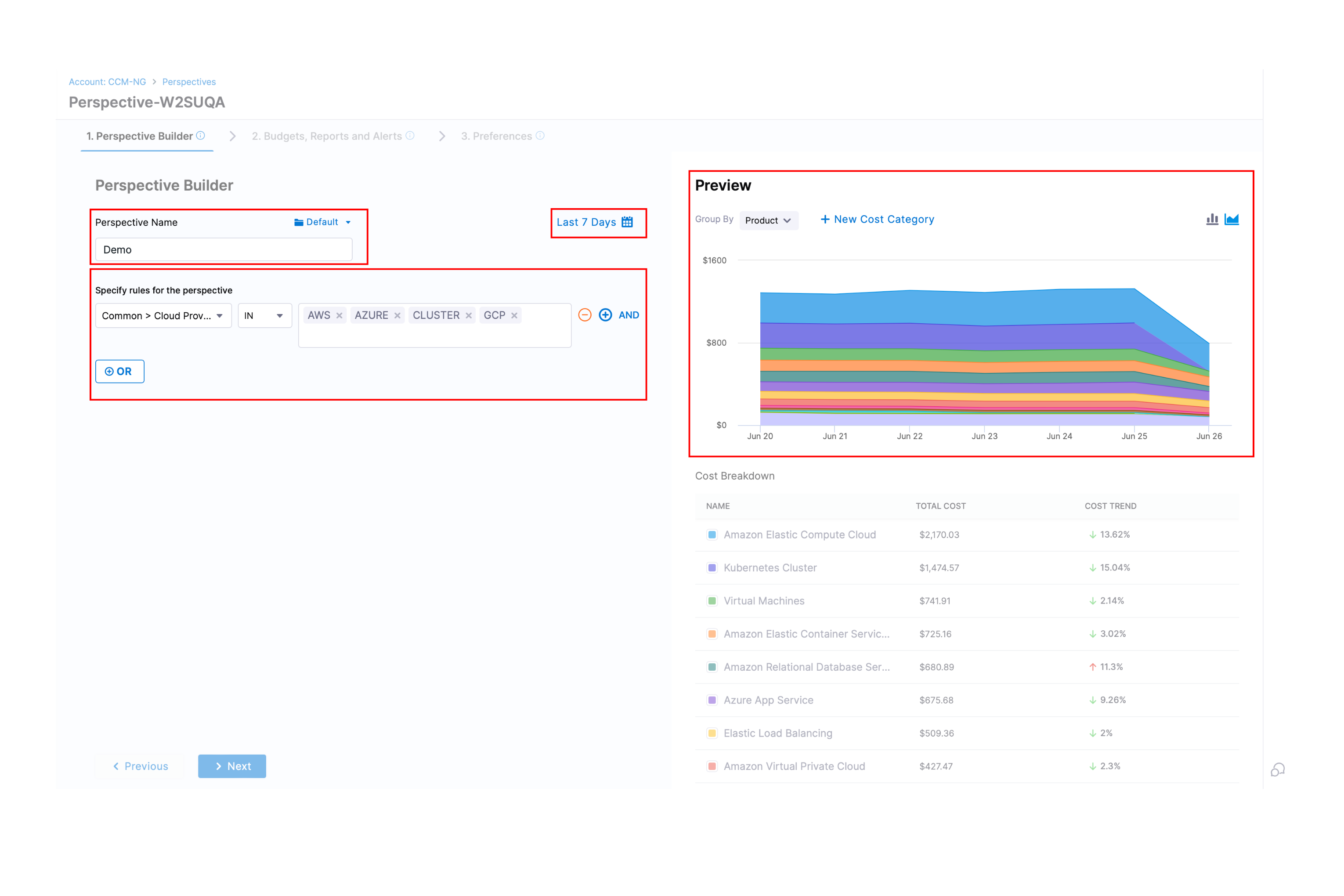 As you build your perspective, a real-time preview appears on the right side of the screen that shows a graph of the cost data based on the rules you have added, along with a cost breakdown.