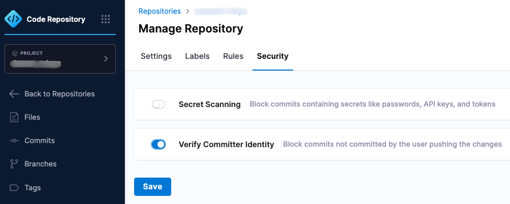 This security setting in Harness Code Repository enforces commit email verification. This setting can be enabled under Repository → Manage Repository → Security.