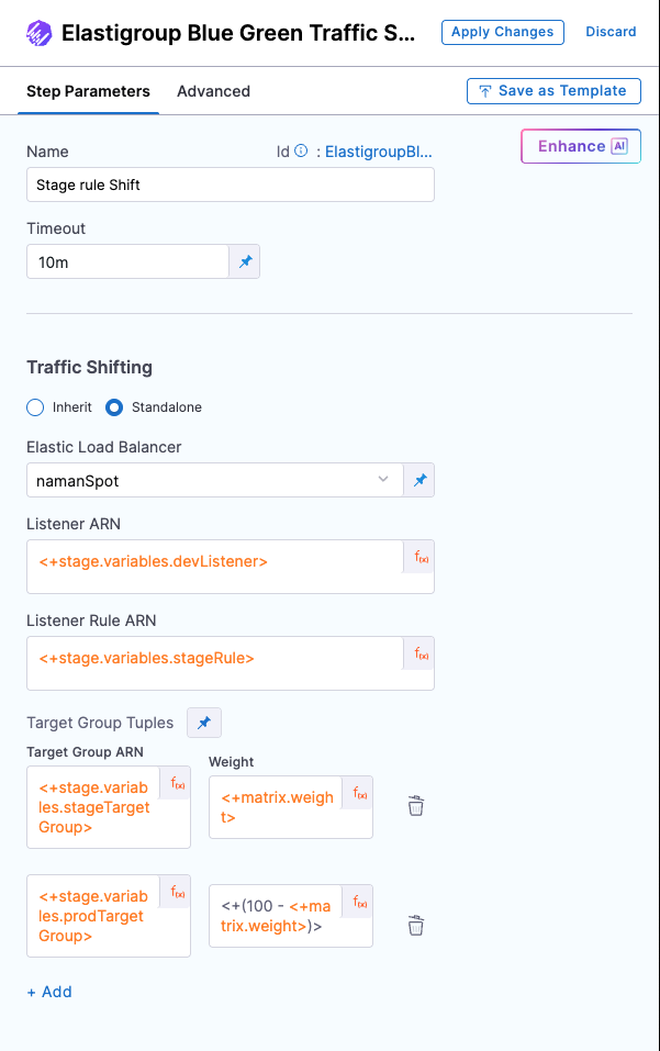 If the Use Shift Traffic checkbox is not selected for any of the Load Balancer Configurations, the Elastigroup Blue Green Traffic Shift step will not be included in the pipeline execution flow.