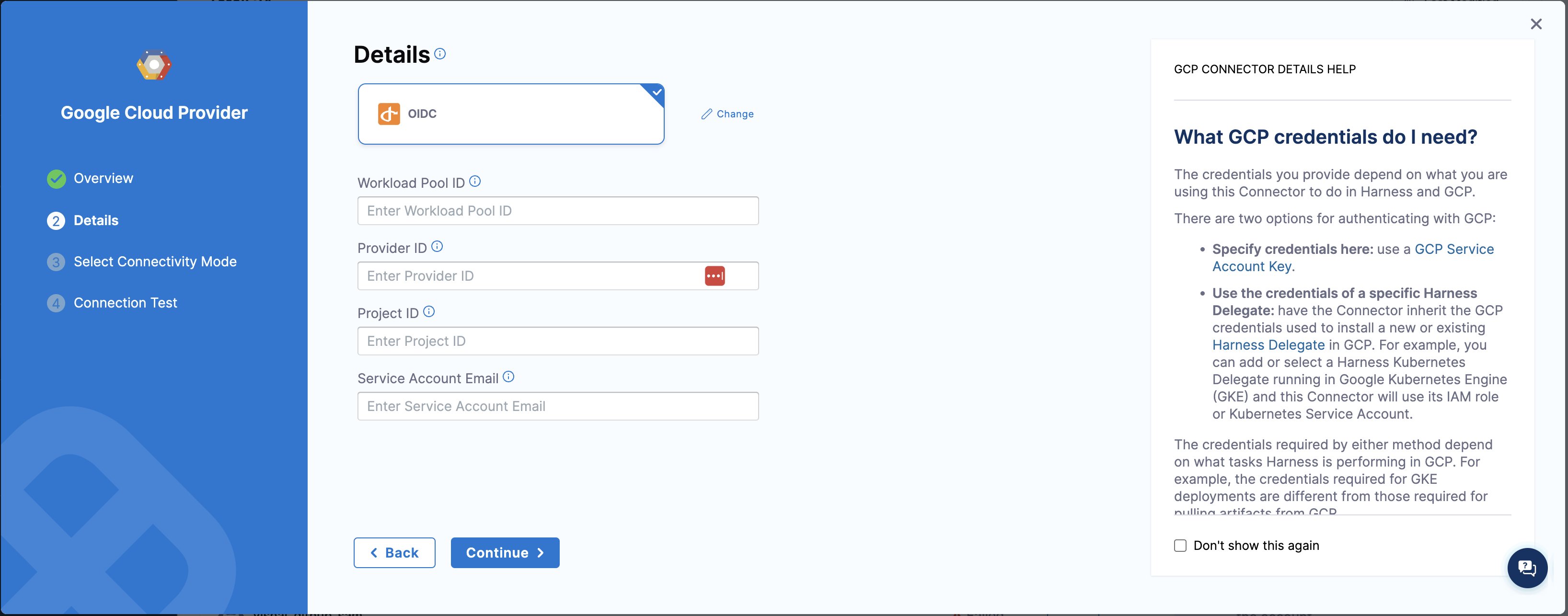 - In Google Cloud Provider Details, create or select the Harness GCP connector, GCP project, and GCP region, and select Save.