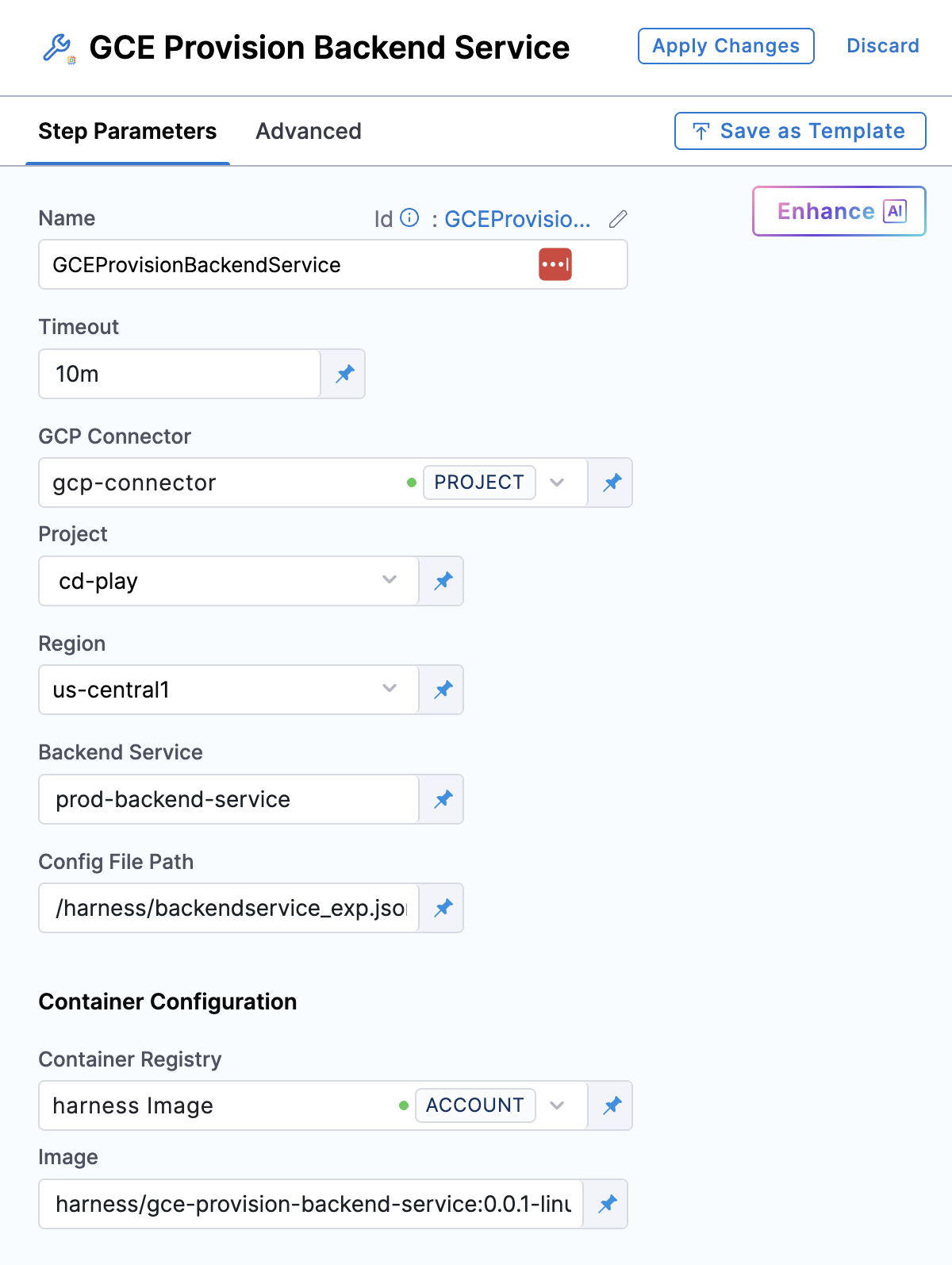 | Config File Path | Path to the backend service configuration JSON file. This path must match the Download Directory Path configured in the Download Harness Store step, combined with the filename (e.g., if download directory is /harness and filename is backendservice.json, use /harness/backendservice.json). | Yes |
