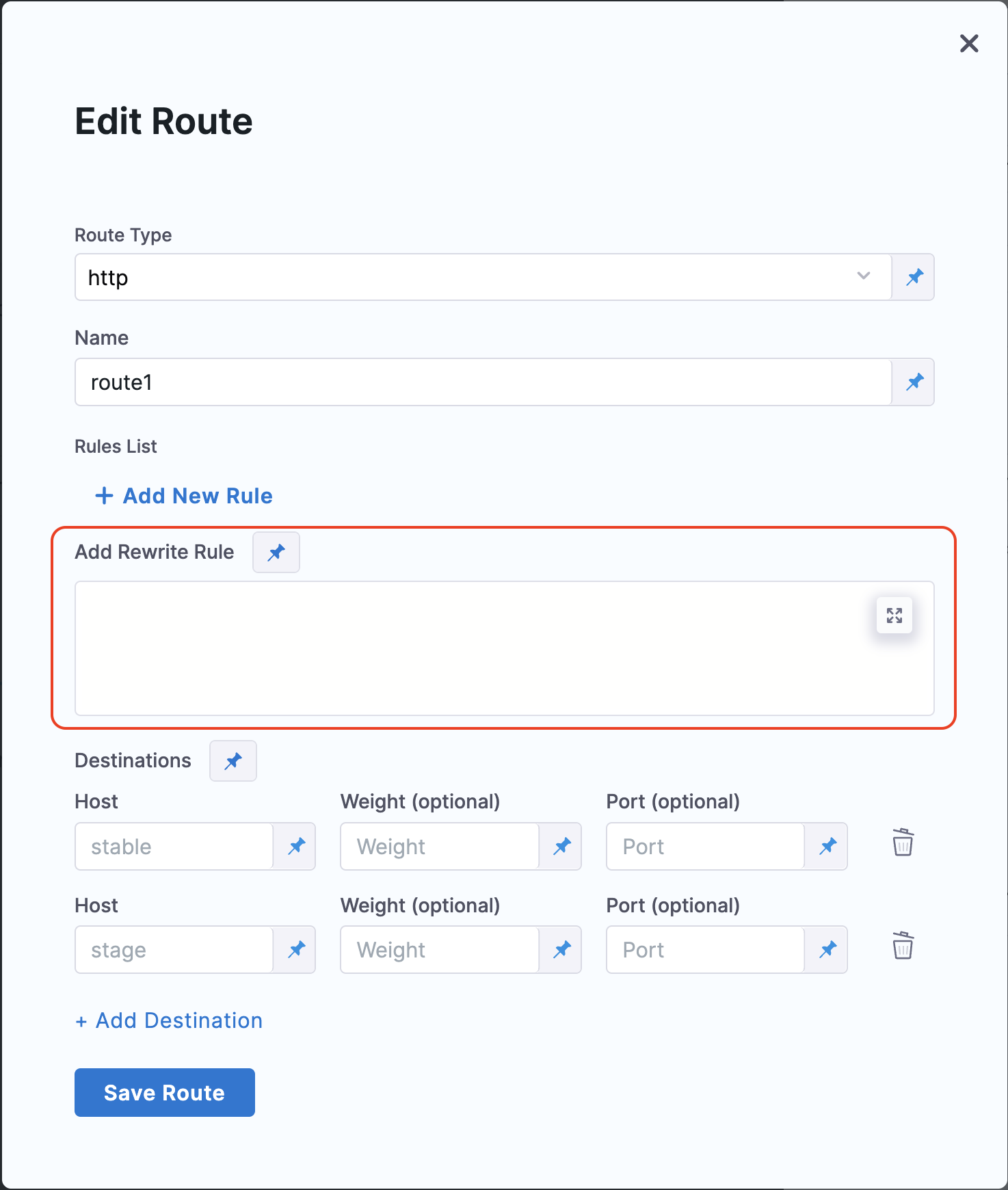 First one is to configure the Route Name and second one is to configure destination(s) which you want to update. Route name is an ID for us to know which traffic routing resource we need to update. The value of the route name should match one of the route names defined during the New config step configuration.