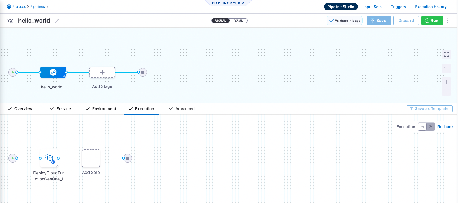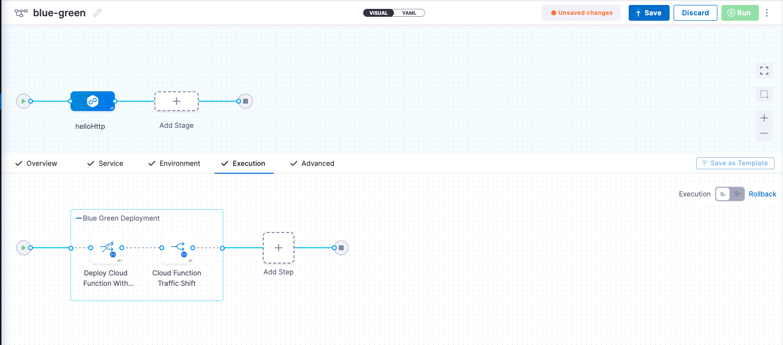 harness pipeline --file "/google_cloud_function/2nd_gen/bluegreen-pipeline.yml" apply - You can switch to the Visual pipeline editor and confirm the pipeline stage and execution steps as shown below.