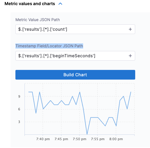 - In Metric values and charts, select a Metric Value JSON Path and Timestamp Field/Locator JSON Path and select Build Chart.