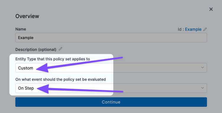 The Policy Set you select must be evaluated On Step.Currently, only the Custom entity type is supported. The Policy Set you select must have the Custom entity type selected.