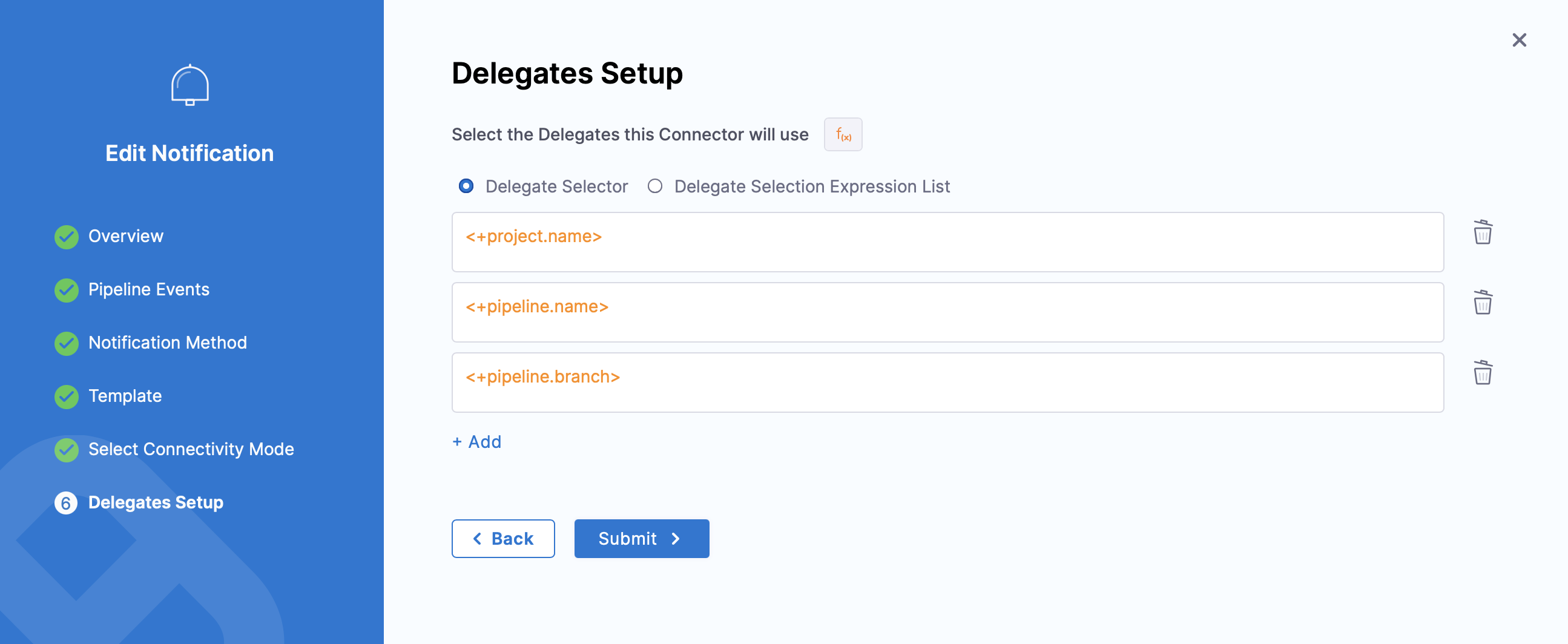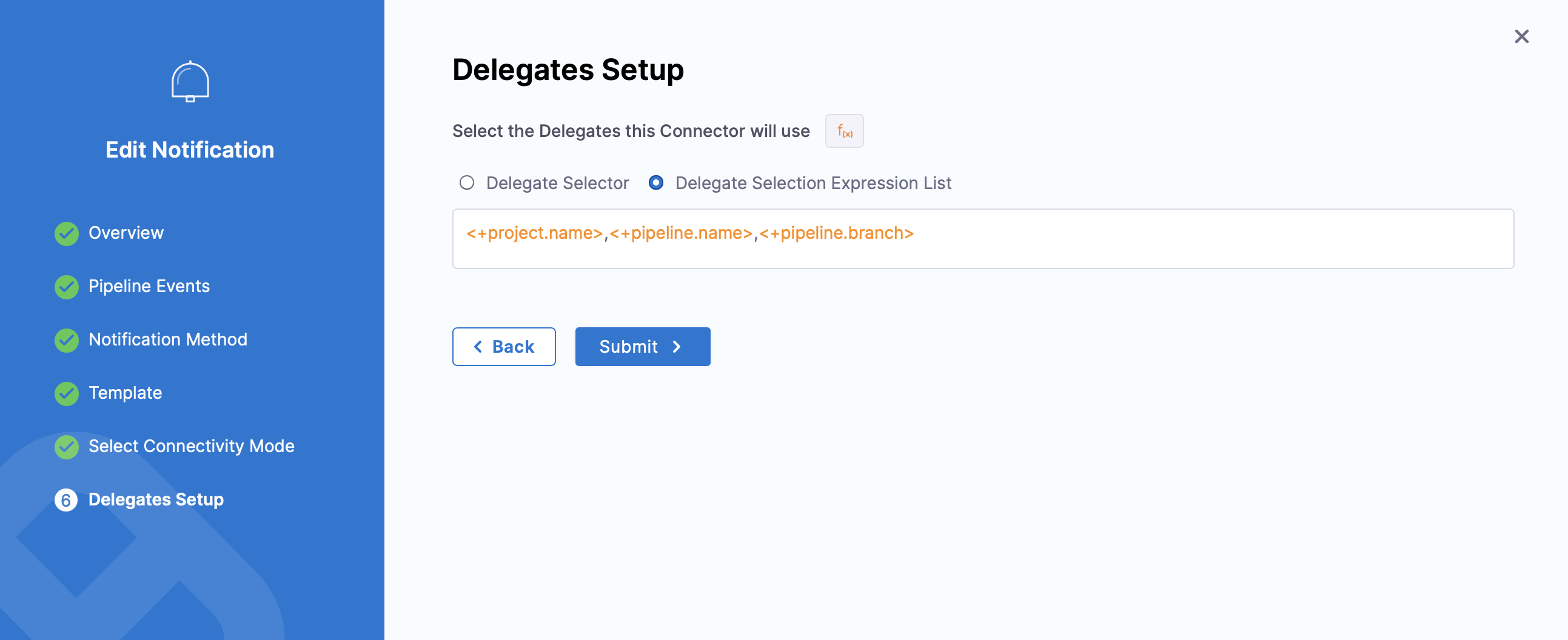Currently, the feature that allows you to pass Expressions for selecting delegates in Pipeline Notifications is behind the feature flag PIPE_SUPPORT_DELEGATE_EXPRESSIONS_FOR_PIPELINE_NOTIFICATIONS.
