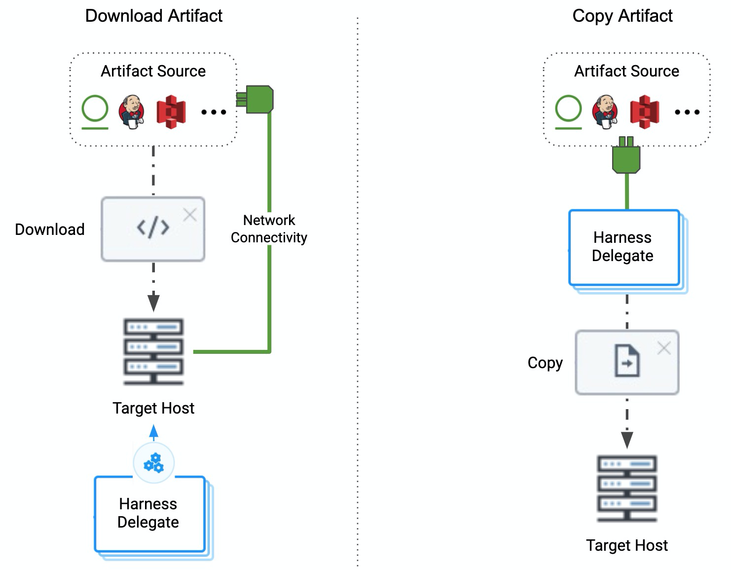 - Download: At deployment runtime, the Harness Delegate executes commands on the target host(s) to download the artifact directly to the target host(s). The delegate must have access to the target host(s) and the target host(s) must have network connectivity to the artifact server.