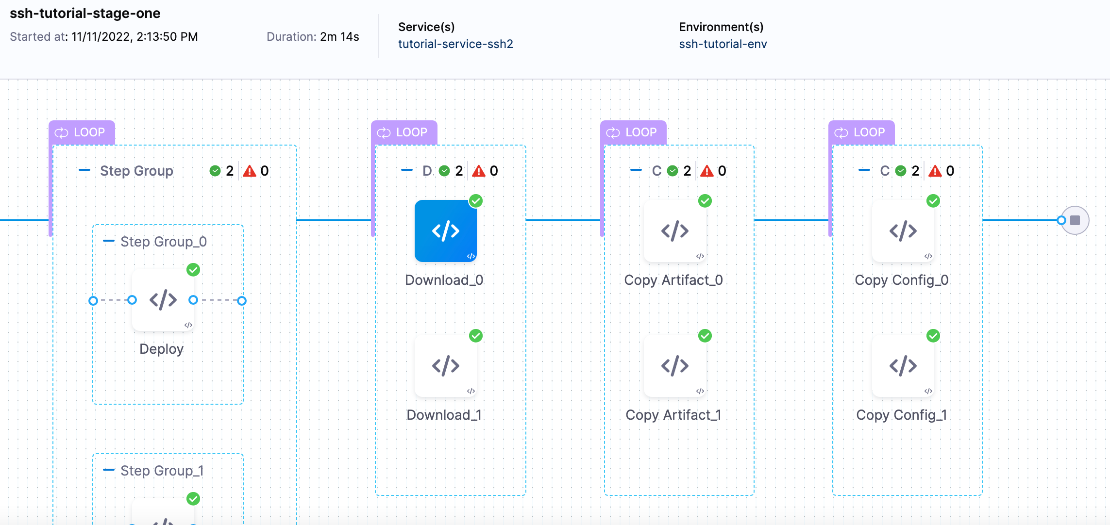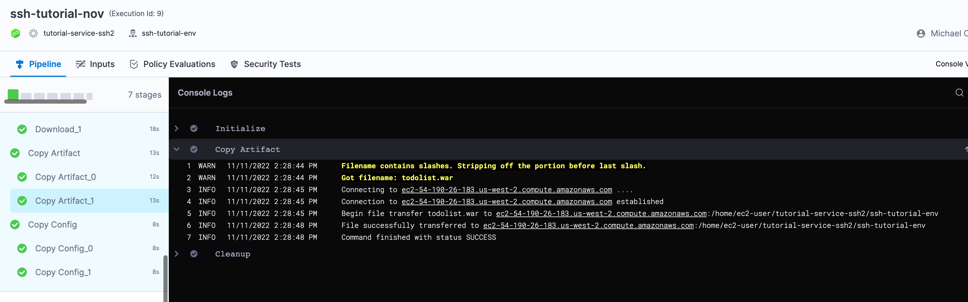 For example, a destination path for a stage that deploys todolist.war using a service named tutorial-service-ssh2 to an environment named ssh-tutorial-env will look like this: