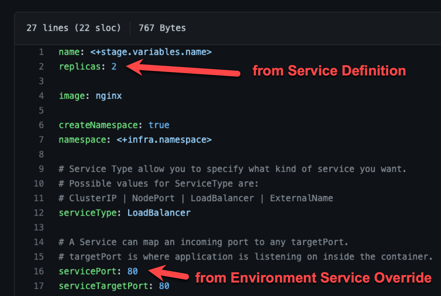 At runtime, the name:value pairs from the environment Service Overrides values YAML fully override the service values YAML. The replicas: 2 and servicePort: 80 from the environment Service Overrides are used.