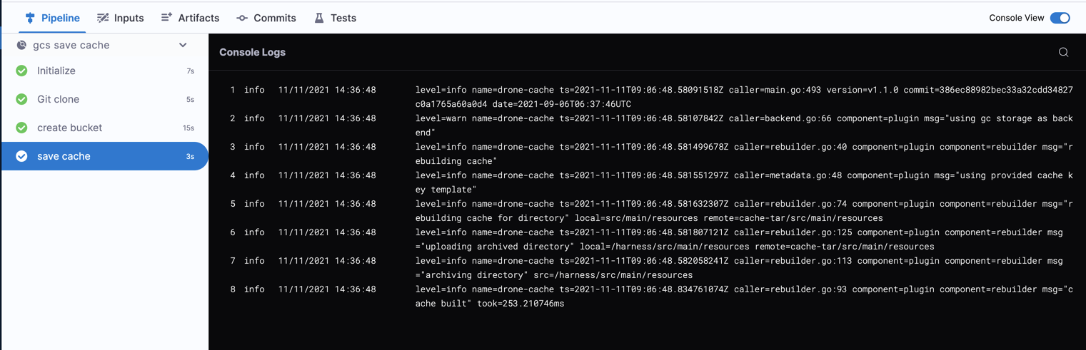 connectorRefThe GCP connector ID.bucket: The GCS cache bucket name.key: The GCS cache key to identify the cache.sourcePaths: Files and folders to cache. Specify each file or folder separately.archiveFormat: The archive format. The default format isTar.