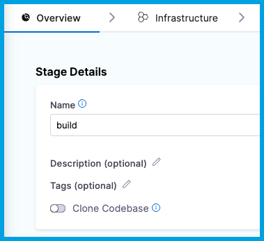 - Make sure Clone Codebase is enabled. This tells Harness to clone the codebase into the build environment before running the steps in the stage.