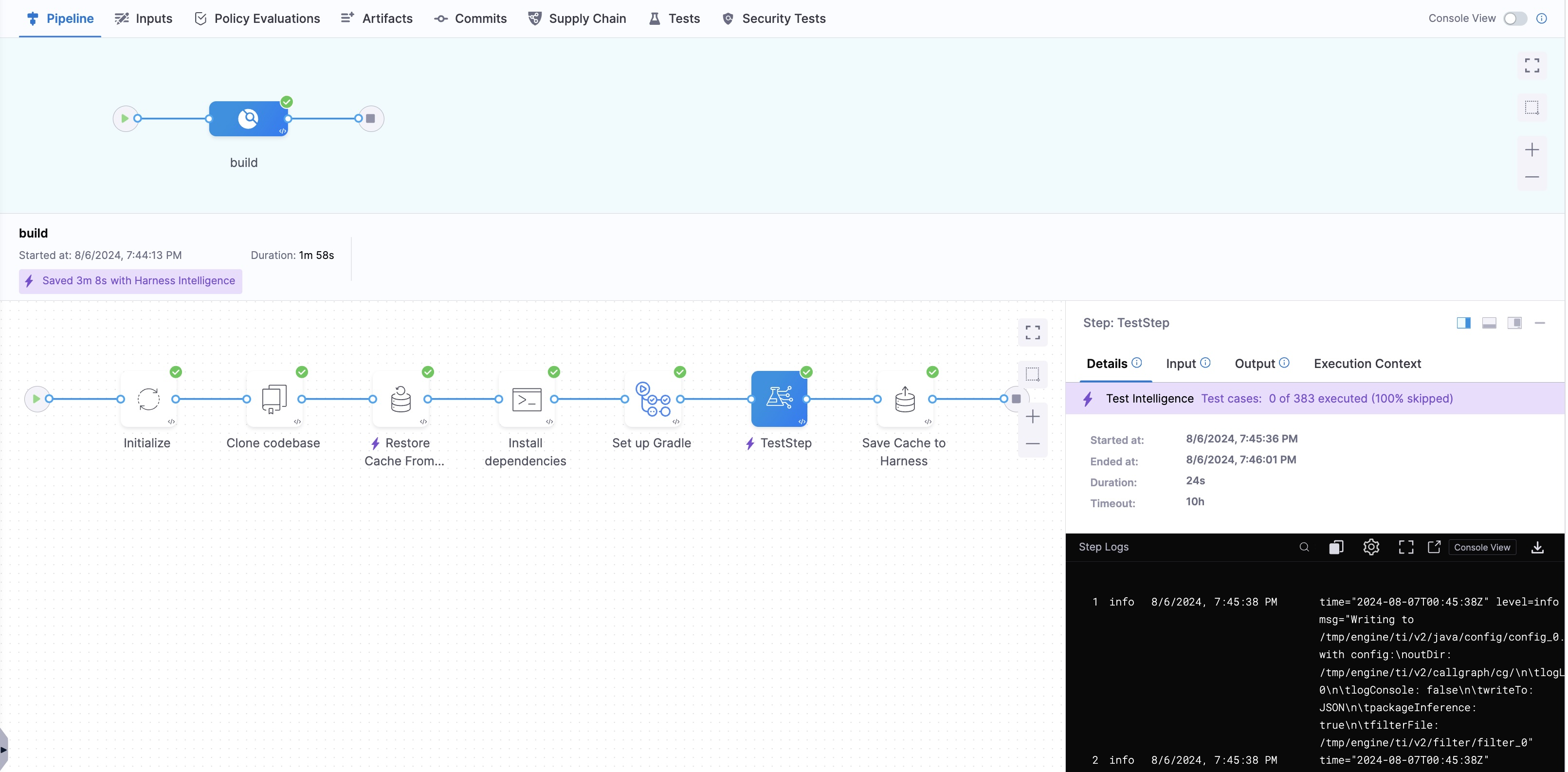 Harness Intelligence optimizes your build stages by reducing execution times and providing insights into where time savings are achieved. This section explains how the time savings are calculated and displayed, helping you understand the benefits of using Harness Intelligence features.