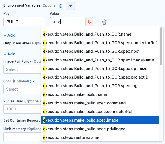 You can inject environment variables into the step container and use them in the step's commands. You must input a Name and Value for each variable.