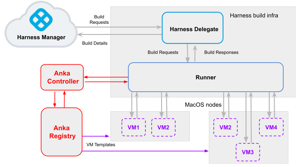 This topic describes how to use AWS EC2 instances to run a macOS build farm with Anka's virtualization platform for macOS. This configuration uses AWS EC2 instances and dedicated hosts to host a Harness Delegate and Runner, as well as the Anka Controller, Registry, and Virtualization. Working through the Anka controller and registry, the Harness Runner creates VMs dynamically in response to CI build requests.
