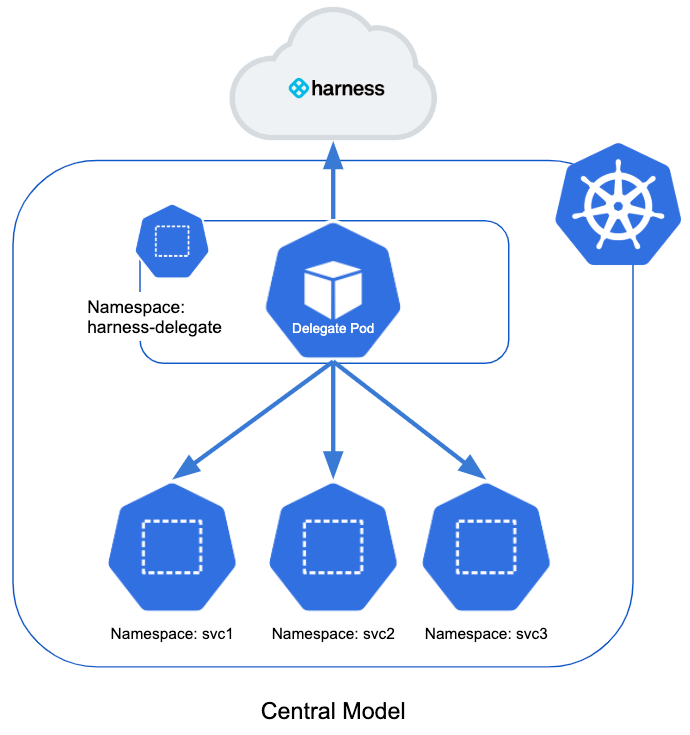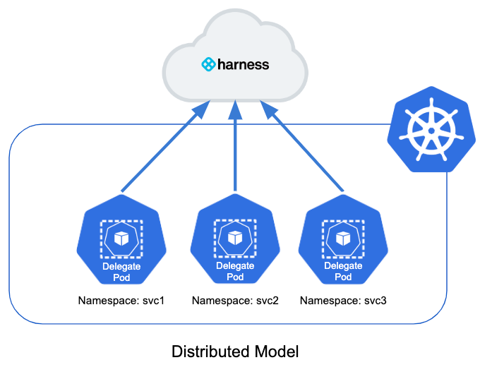 This model places a delegate in each namespace in the cluster. It limits each delegate to deploying into its own namespace.