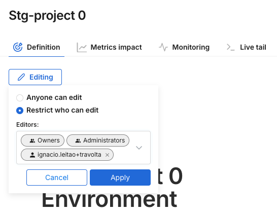 Staging: No environment level permissions are set. This means that, by default, any user can edit any object. An owner of the object (or admin) can click on the Permissions toggle to set permissions for that object to on. If that happens, only owners and admins can edit the object. An owner or admin can add additional editors by either adding a user or group as an owner or as an editor. Editors can also be removed.