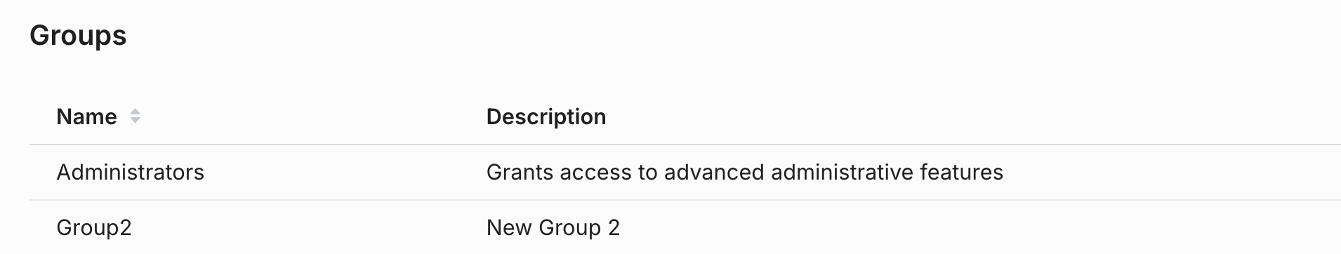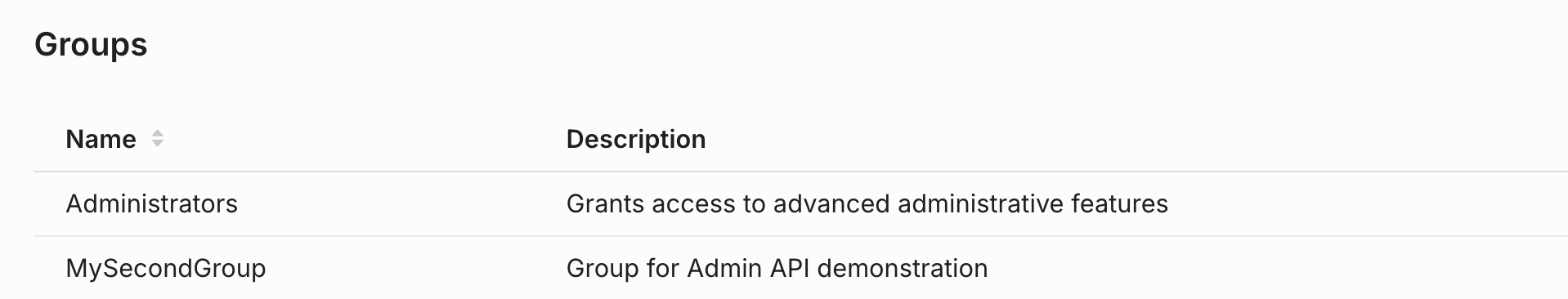 The above command creates a group called Group2 with a description of New Group 2. Group names are the primary keys, so an account can only have a single group with a single name.
