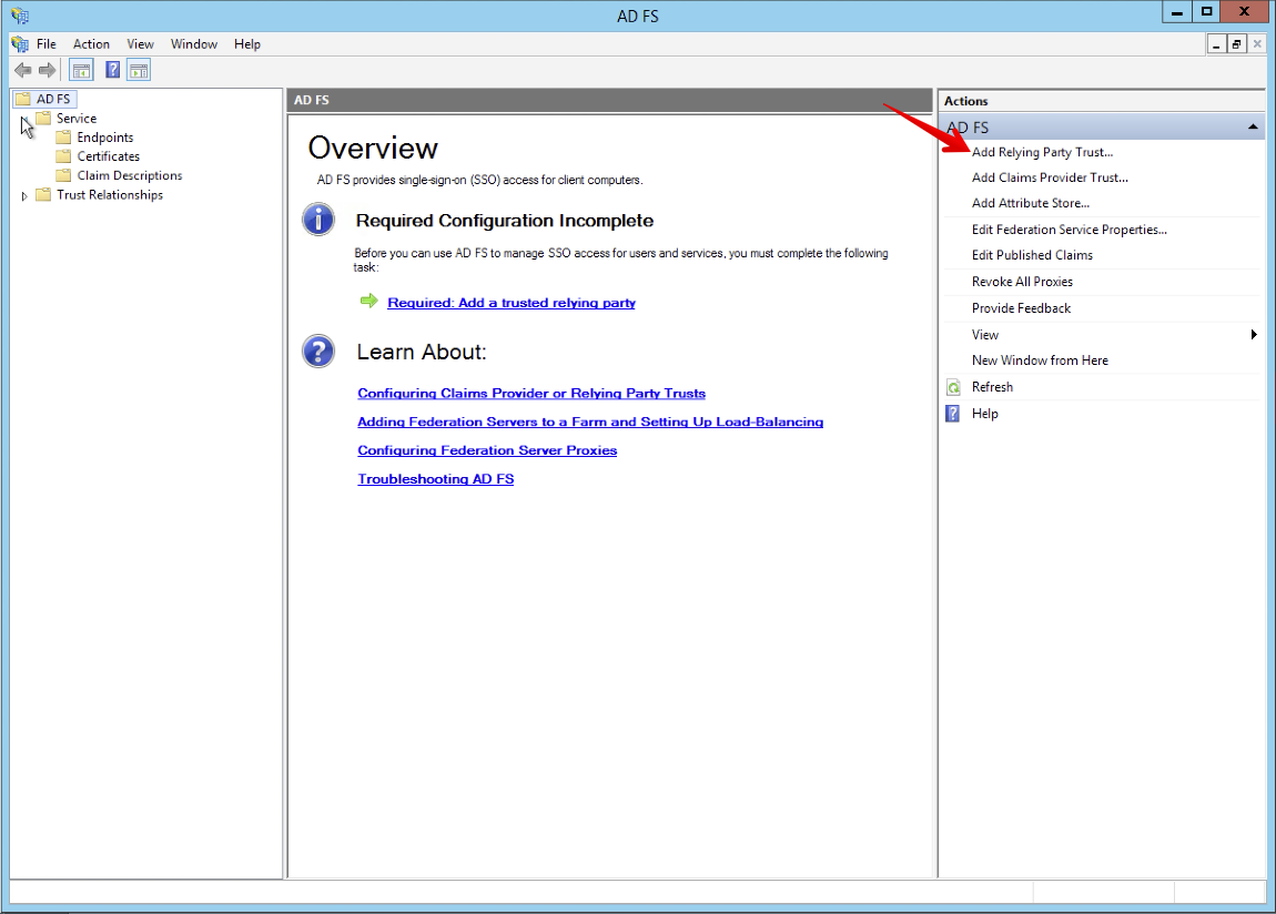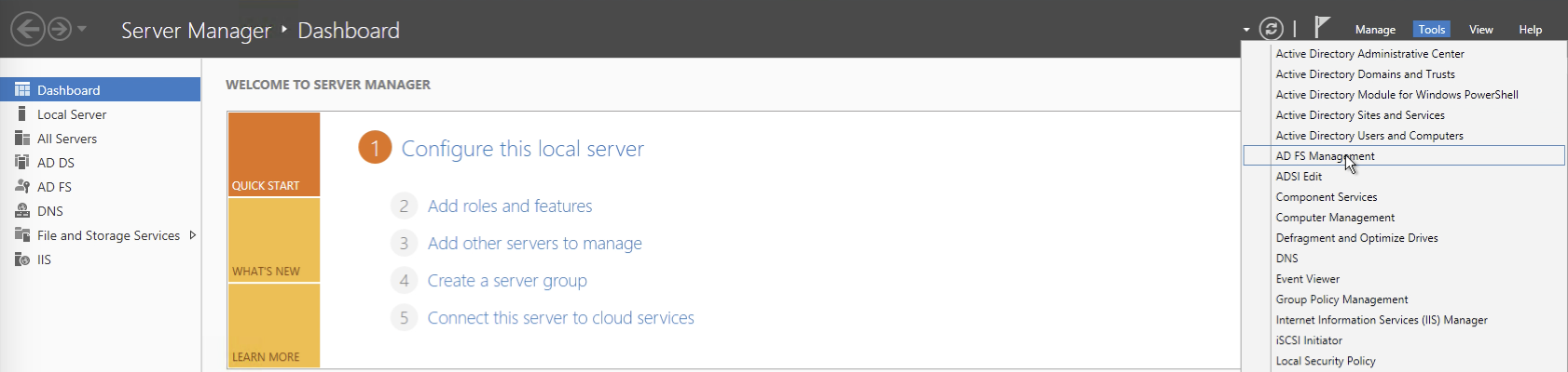 Open the AD FS management console by going to the Server Manager console and selecting AD FS Management from the Tools list (on the right).