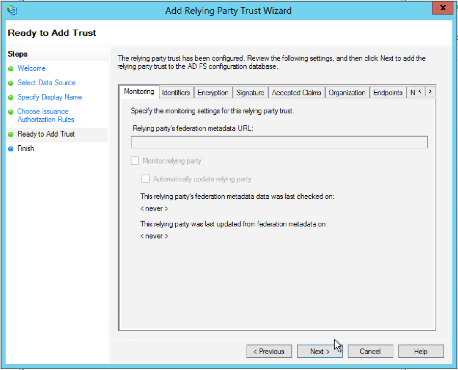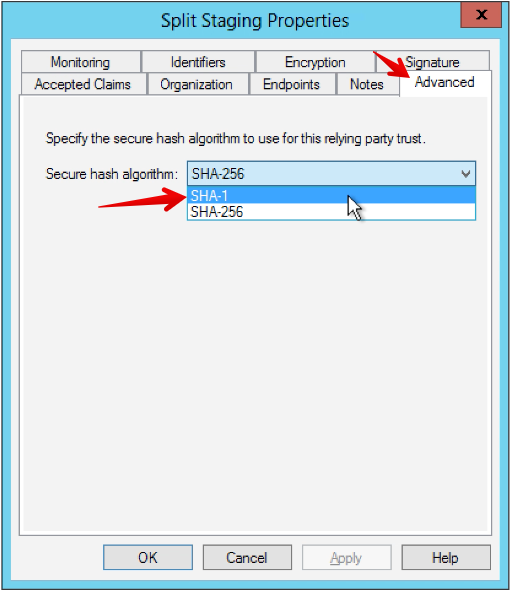 Right-click the properties of the relying party trust and select the Advanced tab.