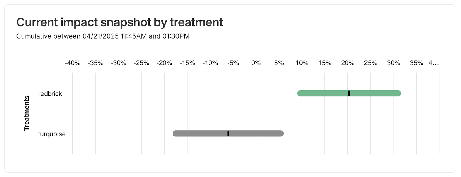 The Current impact snapshot chart visually represents how your metric is performing relative to the experiment’s baseline treatment. This chart summarizes the metric results, showing a bar for each treatment (compared with the baseline treatment) using a green, gray, or red bar for a desired, inconclusive, and undesired impact respectively.
