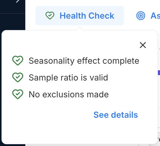 When you click the See details link on the Health Check popup, you will see a slide out modal with your seasonality effect / experimental review period, sample ratio, and sample exclusion details. The possible values for these criteria and additional useful references are described in the sections below.