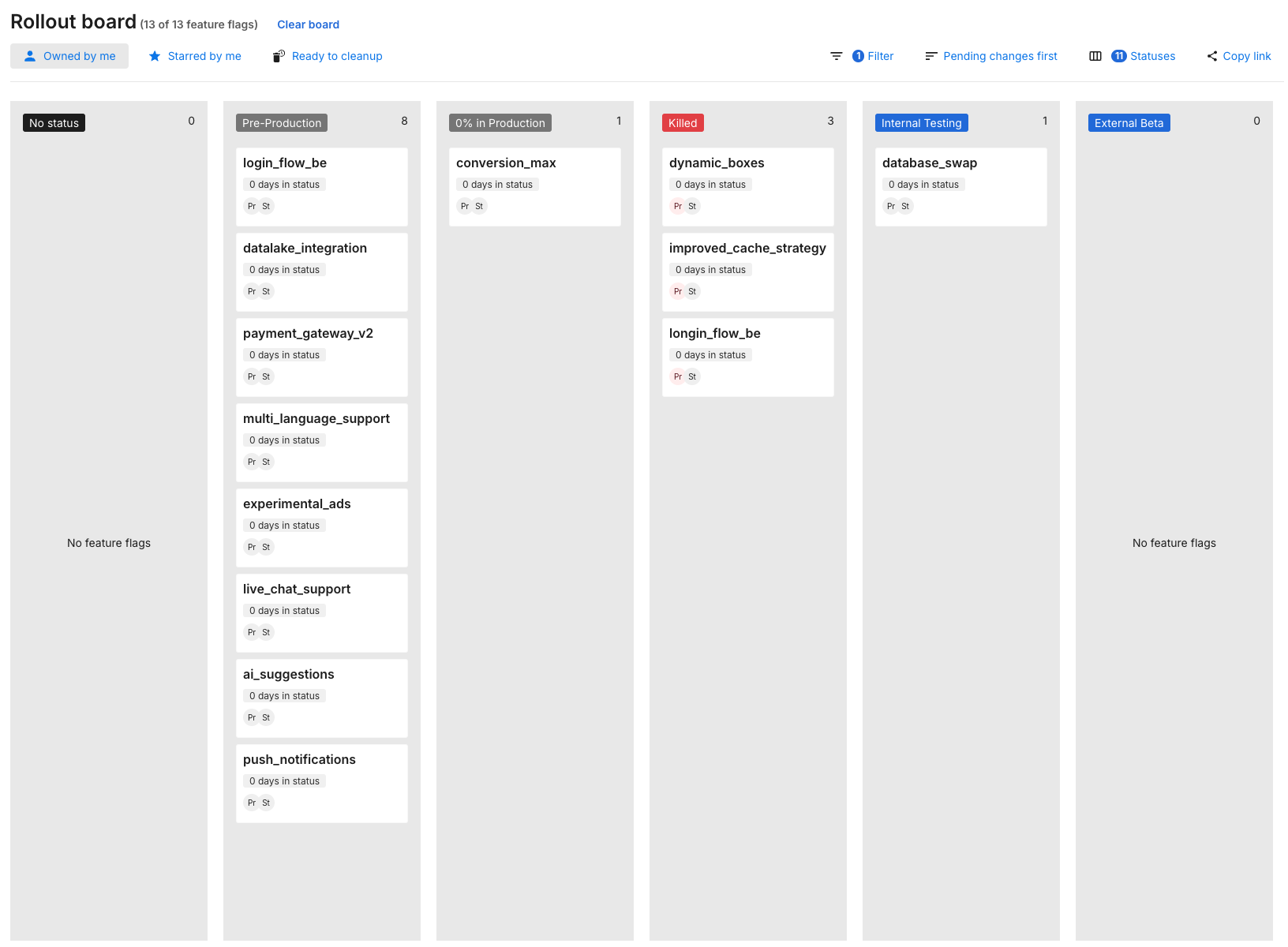 You can also deselect all filters to see a rollout board of all feature flags in the project.