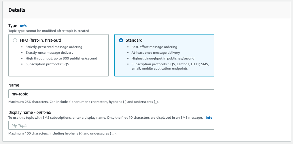 Under Destination > Destination, select SNS topic. Under Specify SNS topic, select Choose from your SNS topics. Find your SNS topic created in the previous section.