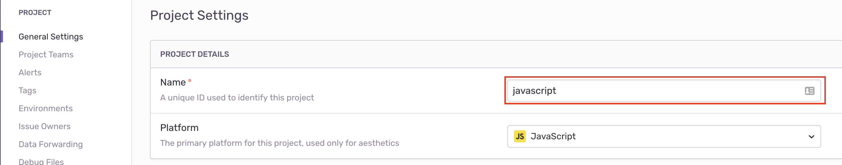 Copy your Sentry Project Slug. You can access this by clicking Settings in the left nav of your Sentry dashboard, then click Projects under the Organization section. Select your desired project from the list there and you can then grab the Project Slug from the General Settings section.