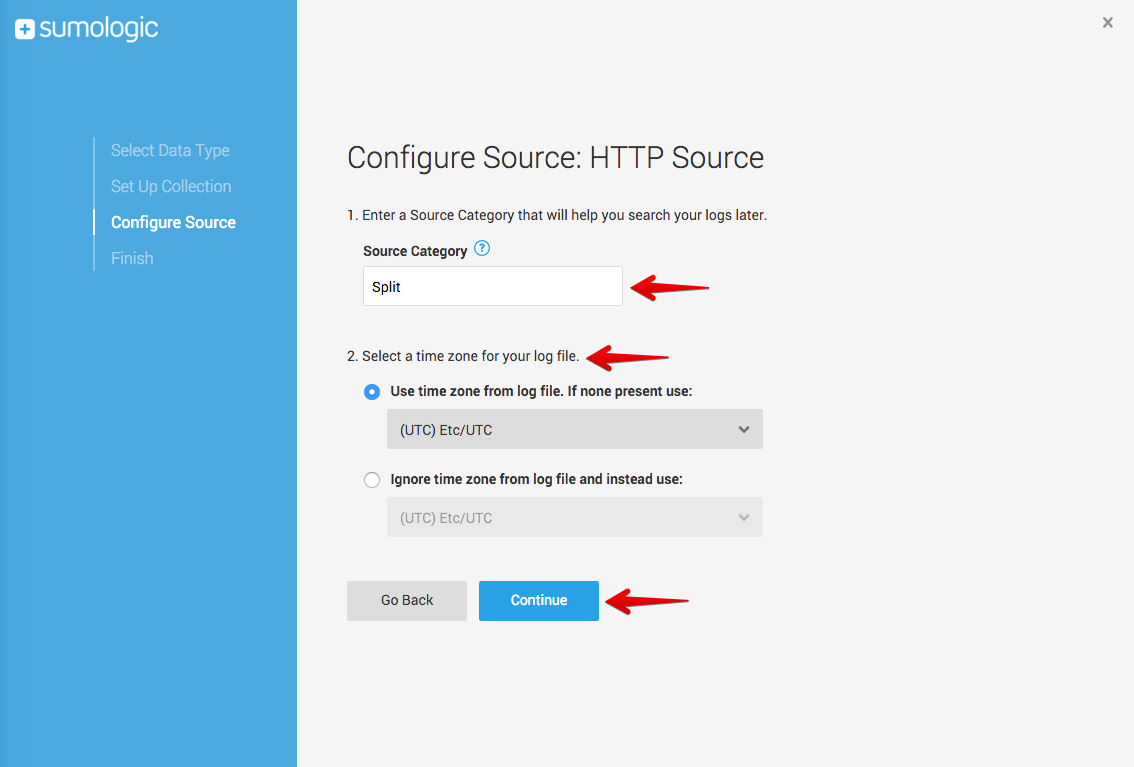 On the Configure Source page specify a Source Category (use Split as the name) and a Time zone, and then click Continue.