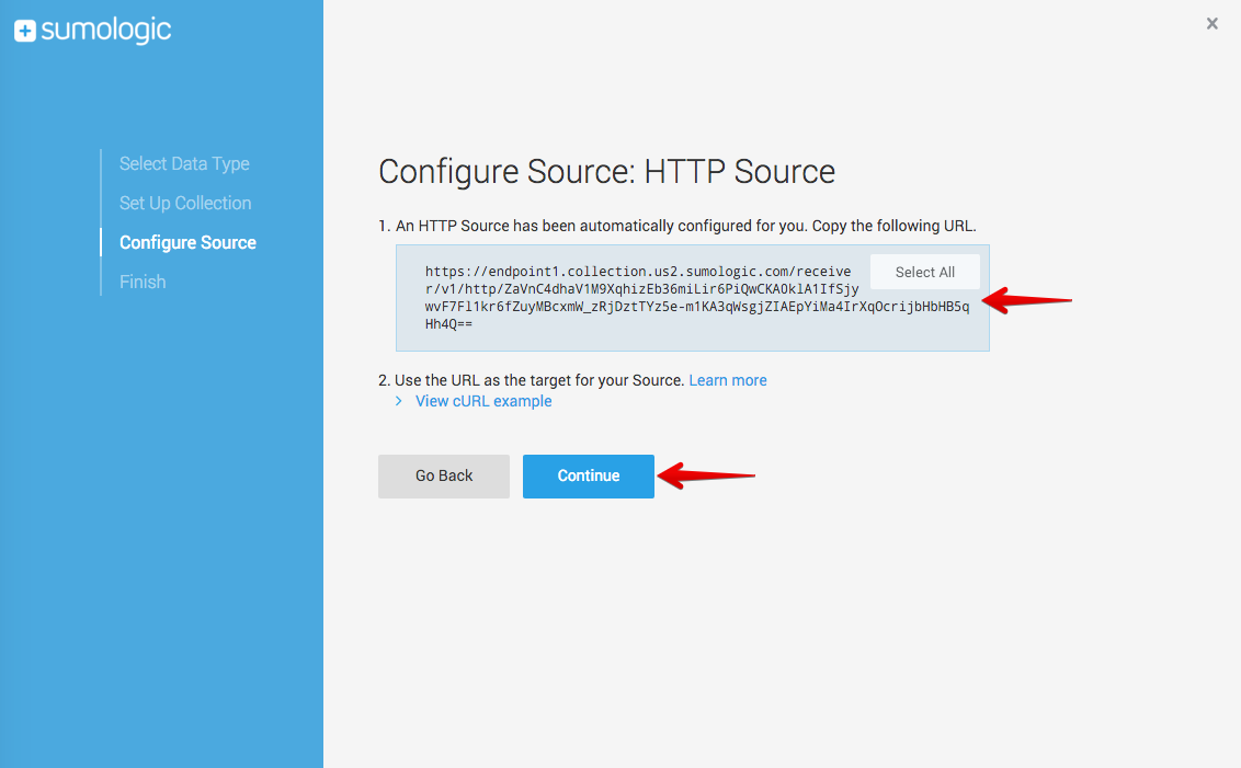 Copy the URL provided to configure the Sumo Logic integration in Harness FME , and then click Continue. This URL contains the token/key used to identify your Sumo Logic account.