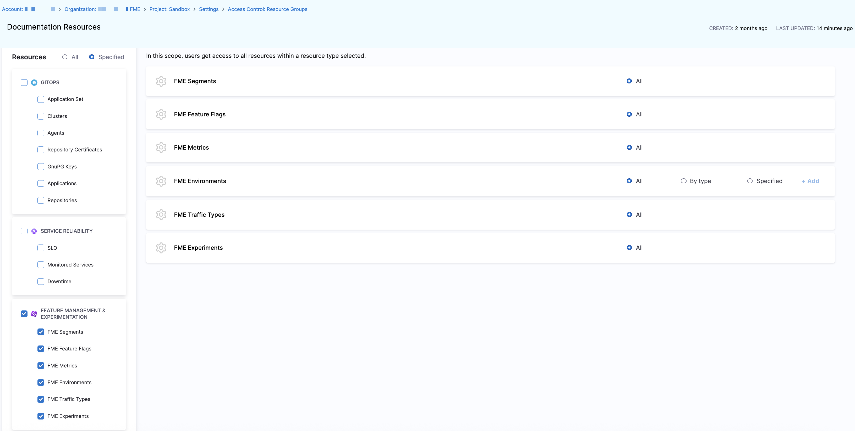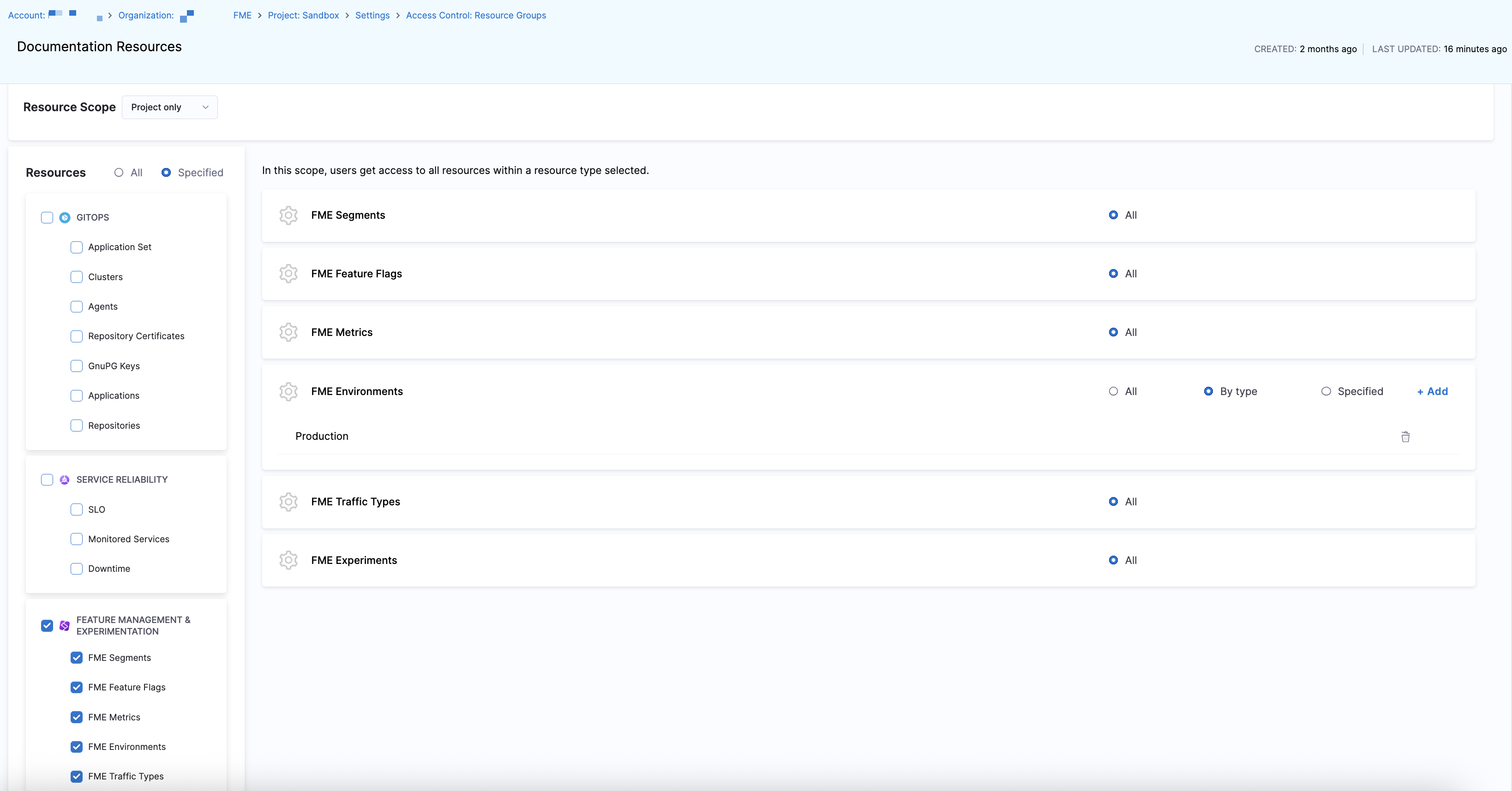 If you are a Harness FME administrator, you can use Resource Groups to control access to FME resources by specific environment and create custom roles to support granular permissions.