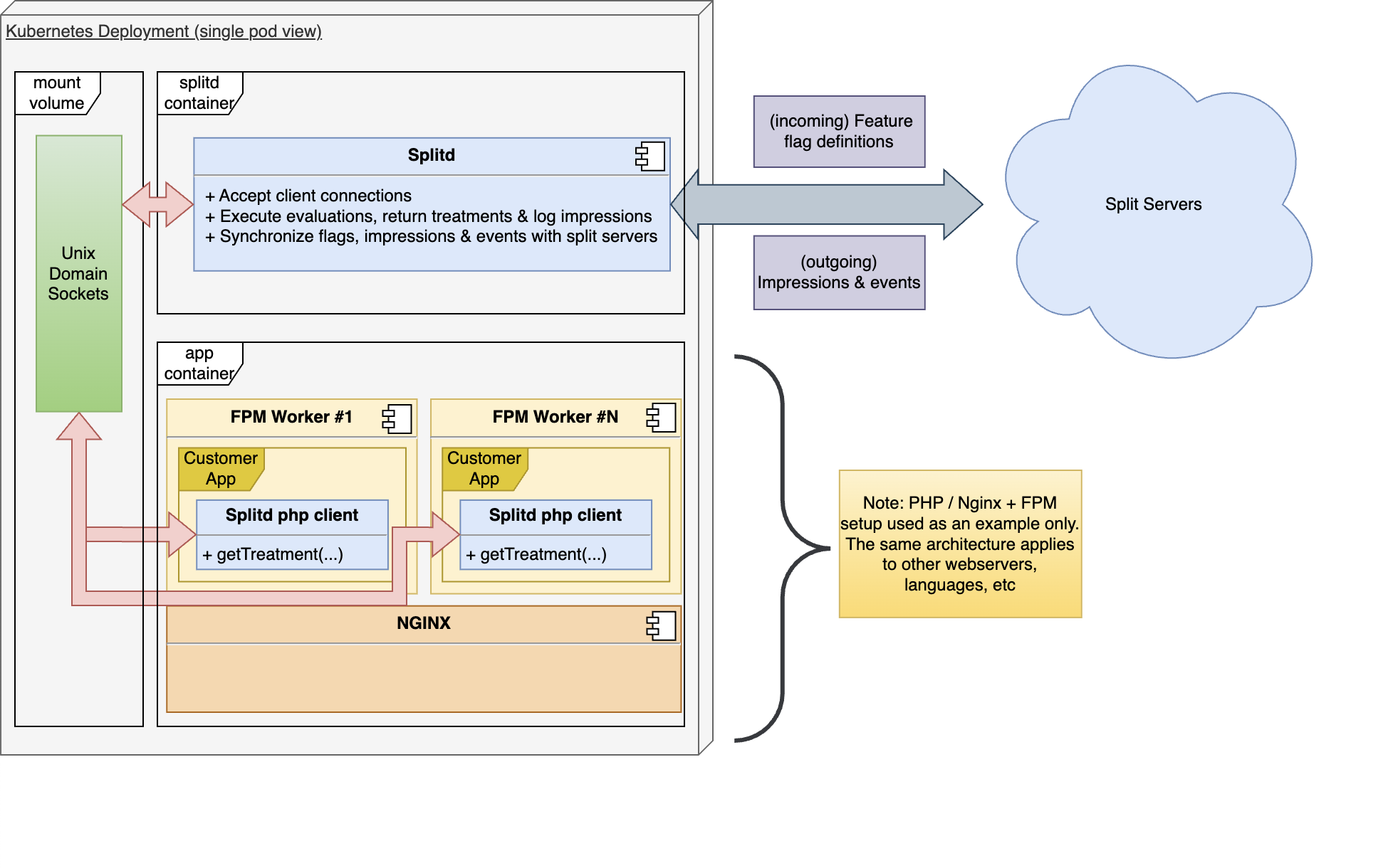 The following image illustrates architecture when splitd is running in a sidecar container.