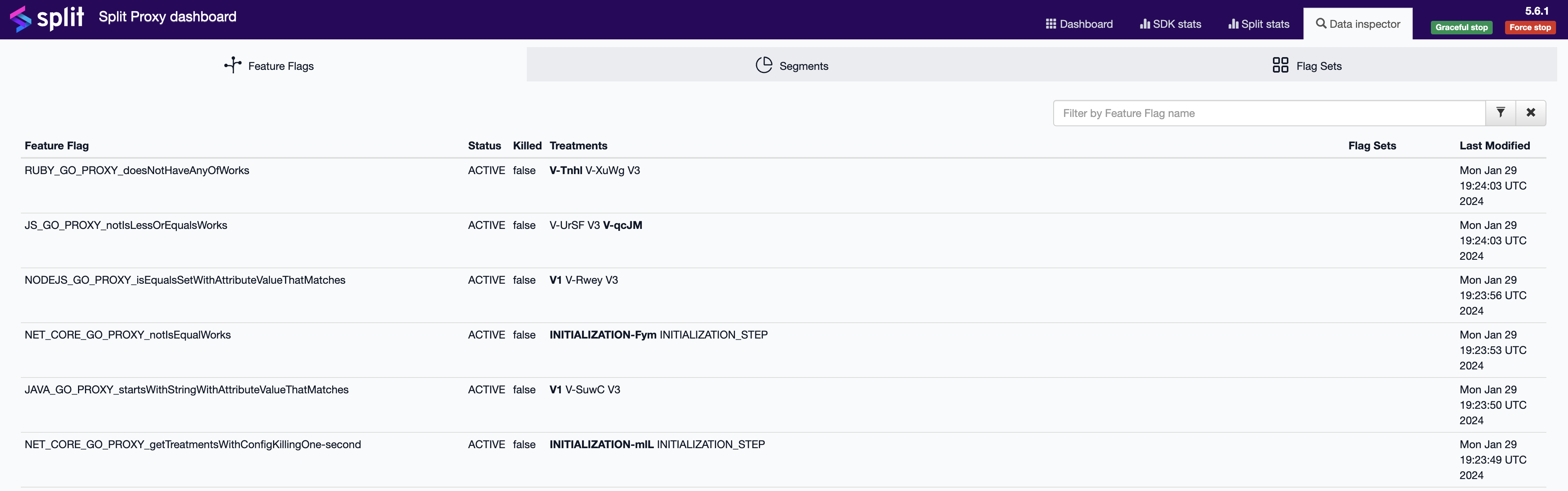 - Data inspector: Cached data showing feature flags and segments; filters to find keys and feature flag definitions