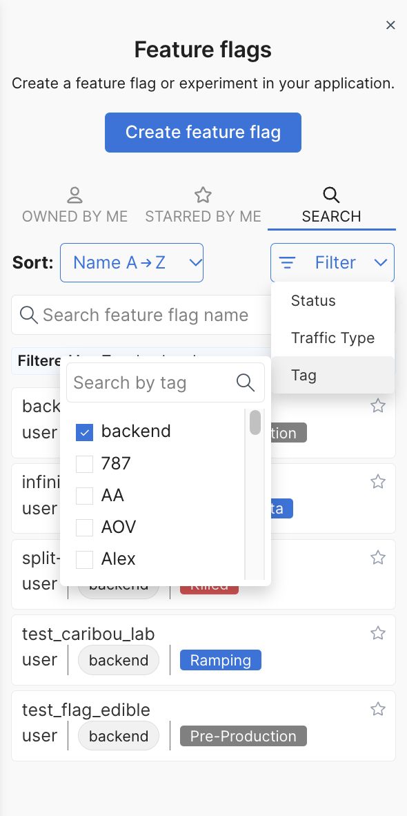 Use tags to narrow feature flags, segments, metrics, or experiments to only the objects that match one or more tags.