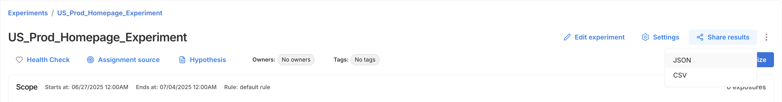 Download experiment metrics, statistical summaries, and warehouse query outputs in CSV or JSON format for further analysis or collaboration with your team.